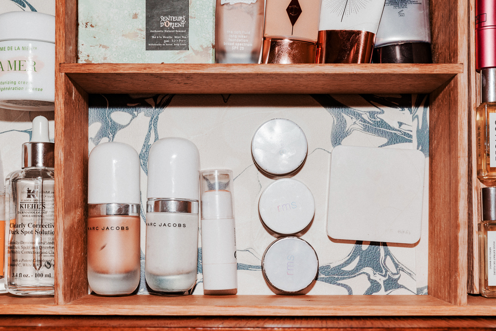 All of Marc Jacobs’ products are incredible. This is the Coconut Primer, and I use the highlighter from him. They really give you a little hit of glow, and you just look awake. I use all the RMS highlighters—those are more for going out. The Charlotte Tilbury Healthy Glow is also really nice, and it’s not really a foundation—it just has a little bit of a bronzer in it. I just got her primer, which is also pretty good.