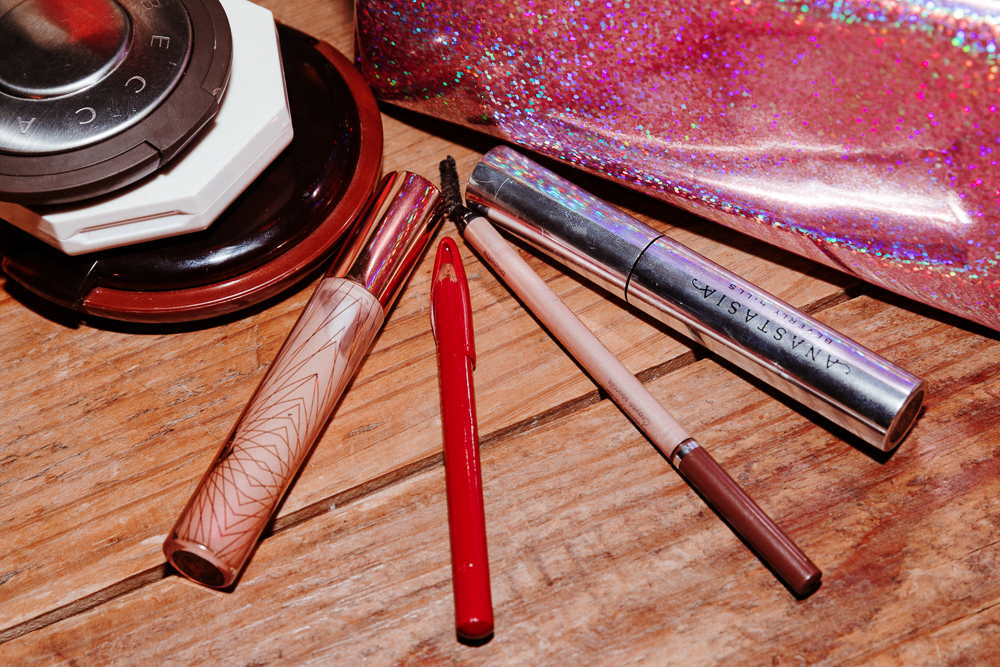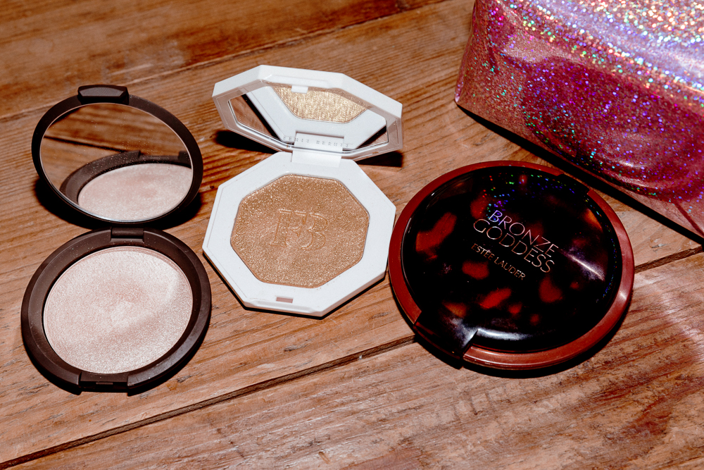 There are certain makeup [products] I really like—good, quality makeup that lasts for a long time. I have my little Rihanna Fenty Killawatt highlighter—Trophy Wife, it’s very gold. You just kind of put your little finger in and put it on your cheekbones, or your clavicle—pretty much anywhere, depending on how shiny you want to look. And then I like this highlighter from Becca, the Shimmering Skin Perfector in Opal.