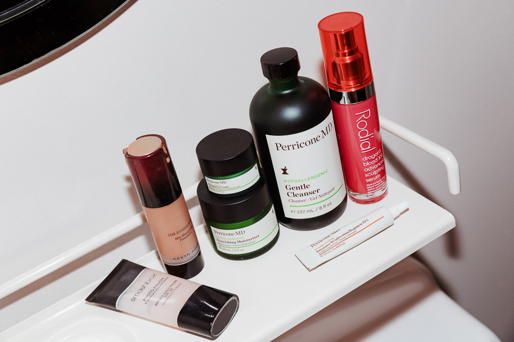 Lately, I’ve been using Perricone MD Nourishing Moisturizer. And then I’ll use Rodial Dragon’s Blood Serum. This is my day-wear—I’ll use this when I come out of a surf, or in the morning. Right before bed I use a series of treatments. I cleanse with Perricone MD Gentle Cleanser, and then I use Perricone MD Intensive Brightening Regimen 15% Vitamin C, because I have some dark spots. I’m using an eye cream—surfing, you’re in the sun the whole time, and you don’t realize how much you squint. You totally could wear sunglasses that strap on, but it just doesn’t look cool. [Laughs] So I use eye that cream, and then I finish with their moisturizer.