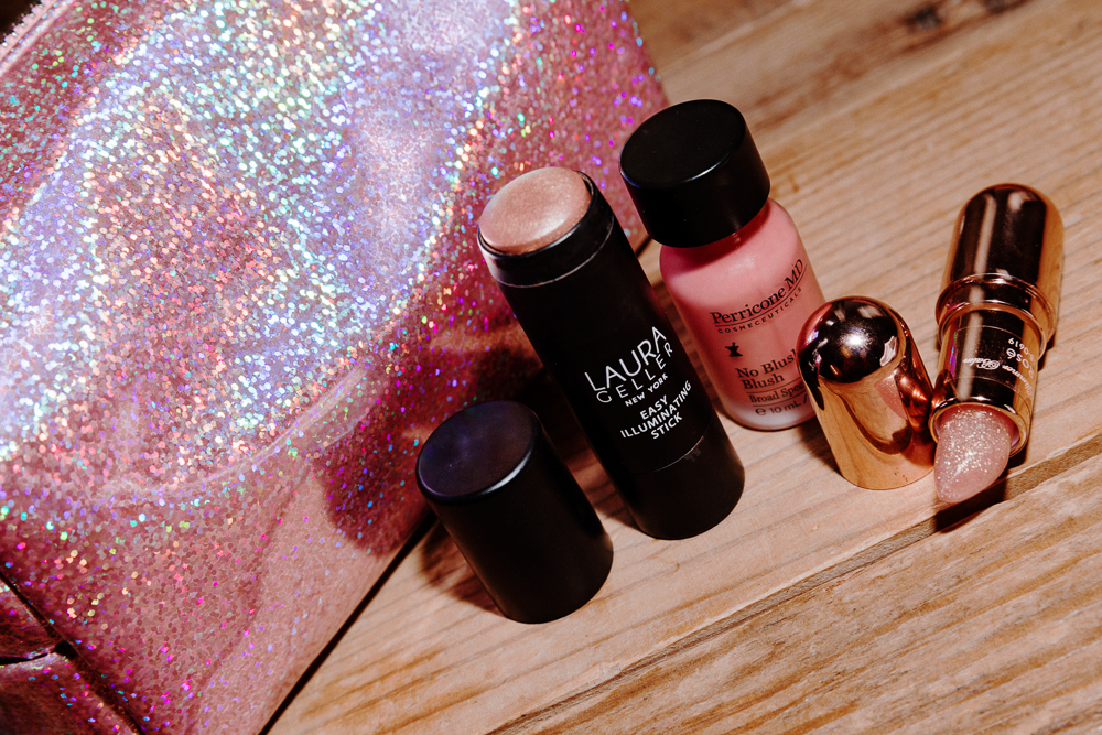 I’ll definitely wear makeup when it’s a night out or something really formal. But other than that, I don’t do foundation too often. Instead, I’ll use my day cream, and then I’ll use Smashbox Photo Finish Primer. It has SPF as well. And then these are my three steps: I do the Laura Geller Illuminating Stick. I love the little shine—it’s like a highlighter. Then I’ll do the Perricone MD No Makeup Blush, because I was told that they used this on Gal Gadot for her Wonder Woman no-makeup makeup look. I love it. Very subtle. I finish with Winky Lux. It’s this lip balm that interacts with your heat—it can be a different color on every person, it’s not one color. But it’s pretty good, and it’s a nice moisturizing balm.
