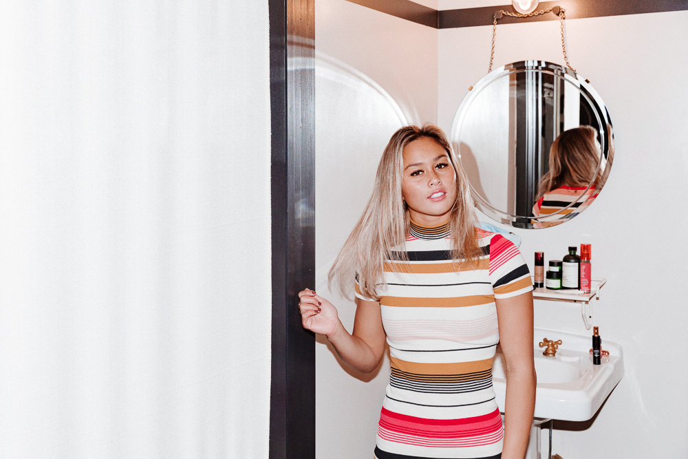 But something I love is an oil from Oshan Essentials. They’re from Maui, so everything’s made there. They have really cool oils with cool names—there’s one called the Opio Oil, and it’s an anti-aging oil that you just kind of put on your face. But you have to wet your face first, and then you just kind of lather it on, let it sit, and then rinse. I do it in the shower—it’s really nice. And have you heard of Kai fragrance? I love their perfume oil so much. It smells floral, just like Hawaii. And home.”