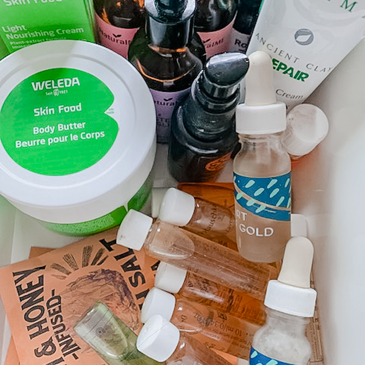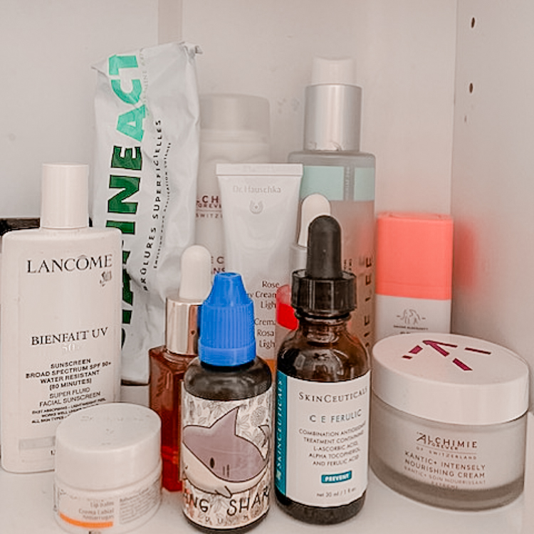 With that comes OG Skinceuticals CE Ferulic serum, first. It’s fine, but I'm eyeing the new Dr. Dennis Gross IPL serum next. After that, I use a hyaluronic acid—I like this Indie Lee Stem Cell Serum that was a gift with purchase. Since it's winter, I'm using the Alchimie Forever Kantic+ Intensely Nourishing Cream. I love the texture and finish, but I hate that it smells like marshmallows. During the summer I use Drunk Elephant’s tinted sunscreen, but right now I’m getting my SPF from a Lancôme gift with purchase. And then the last step in my morning routine isn’t a cream at all, it’s a supplement. I take Mary Ruth’s multi-vitamins, which come in liquid form—I hate swallowing pills. And I also take a probiotic. I’m out the door in 30 minutes or less.
