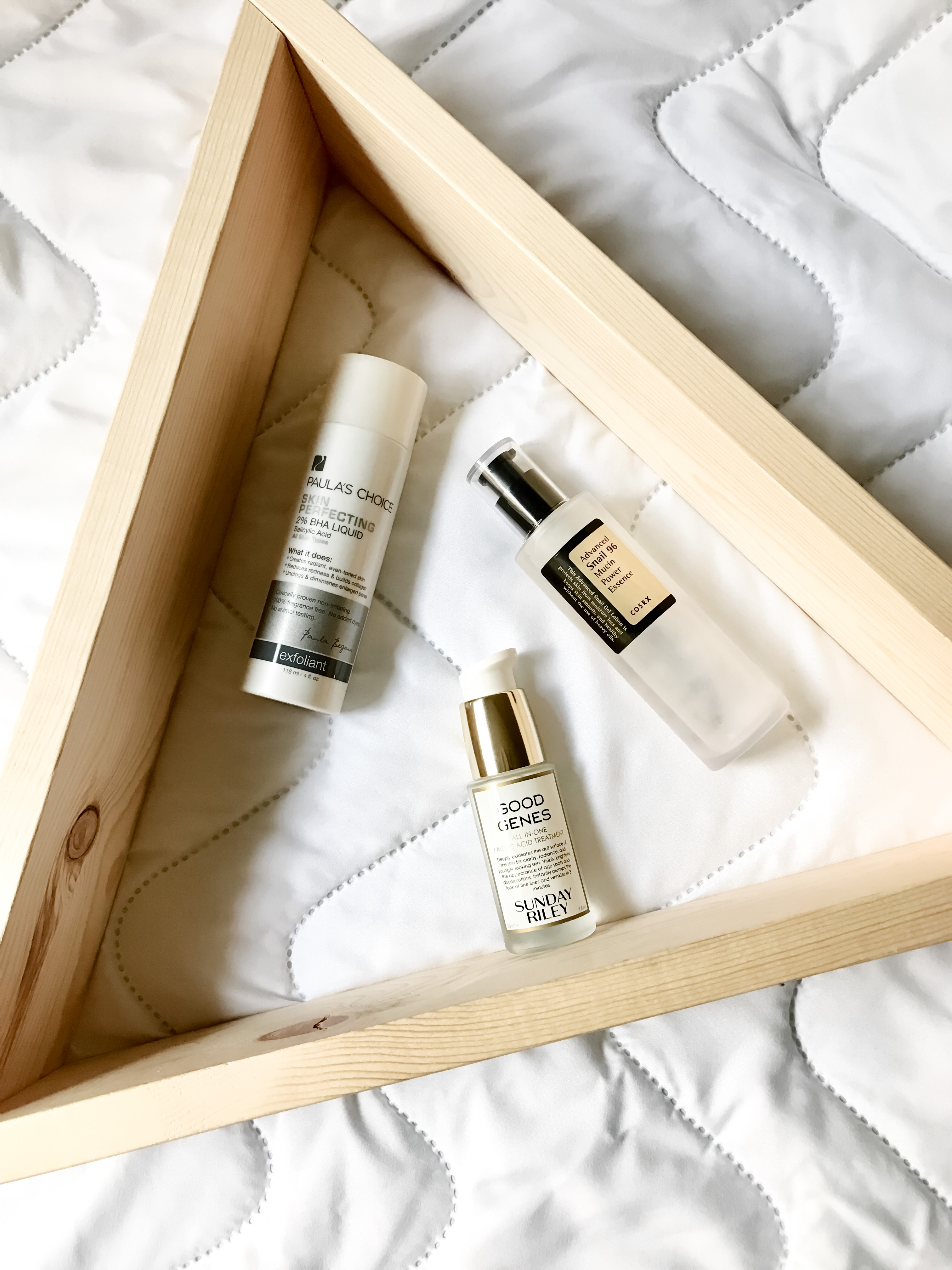 A staple, cannot-live-without routine mainstay of mine is Paula’s Choice 2% BHA Liquid. It’s the first chemical exfoliant I ever tried and is still the one that works best. I love my acids. BHAs give me the best results by unclogging my pores, but AHAs work well for hyperpigmentation. I use both types synergistically to deal with those issues. I keep Peach & Lily The Good Acids Pore Toner in my rotation, alternating one type of acid each night. I found a super detailed, super science-y post on Reddit explaining how 20 minutes is the optimal time for the acids to work on your skin. I don’t know if it’s true, but letting it sit there allows for a one-episode The Office re-watch in the middle of my routine, so I roll with it.