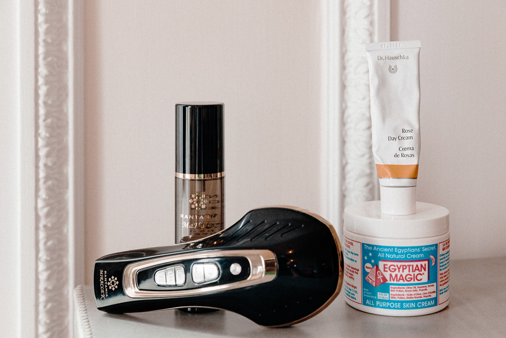 My skincare routine varies because I’m always trying products, but I try to be consistent with facials. I have this incredible girl who’s based in London—her name’s Anastasia Achilleos and she does fascia release. She pulls the skin away from the muscle to activate the muscle, and it changes the shape of your face. She does the body, and she does cranial sacral. I found her through Gwyneth [Paltrow]—I was doing her makeup for her wedding, and Anastasia was giving her a facial every day leading up to it. Because we were staying in the same house [before the wedding] and it was 10 o’clock at night, I was like, ‘Let’s have a glass of wine and watch a movie.’ But then she said, ‘Hm, I’d rather you lie down because I kind of want to treat you.’ She has this hot water body thing that you lie on, and it’s an incredible sensation. I looked like a new person after I had the treatment. She’s incredible. There’s another woman I like—Danuta at Rescue. I’m always on the lookout for new people to try, but I don’t mess around. I think it’s better to be consistent, because I’d rather not have surgery. I think regular facials work, and I also have a hand-held light mask and microcurrent machine. It’s from Rantania—you can only get it in Japan. It’s very effective.