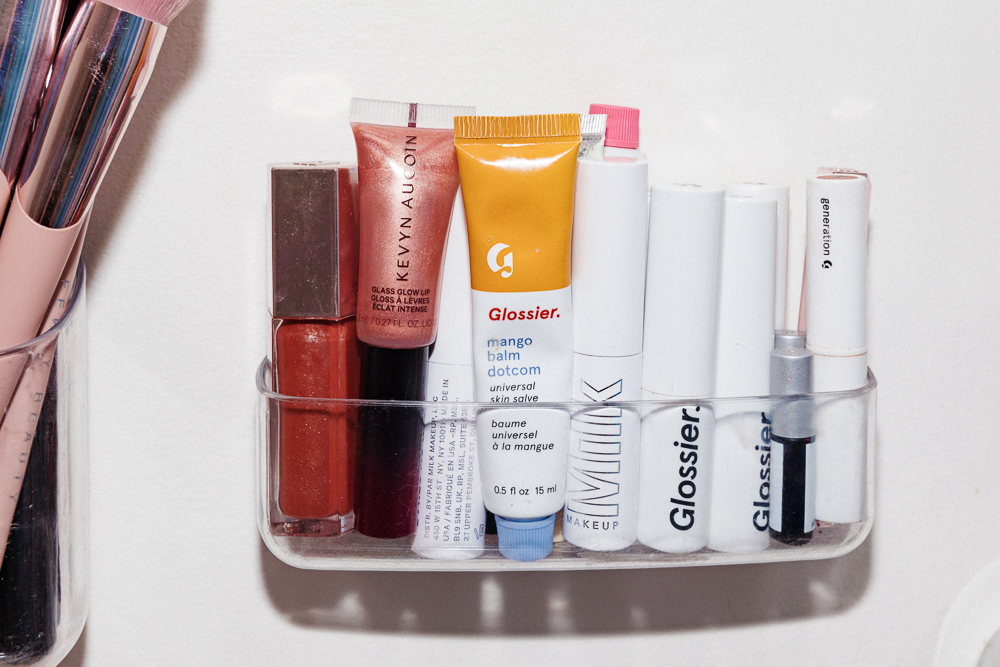 As are many people, I’m obsessed with the Laneige lip mask. And Shayna [Goldberg] put me on to the Bite Beauty Agave Lip Mask in Smashed. It has a little bit of a red tint, and it’s a really soft, bitten color. I sprinted to buy it, and I’ve worn it every day ever since. I also love Glossier Gen G in Jam, and these Milk Makeup tinted Kush lip balms. If you see me out, I’m wearing Fenty Mattemoiselle in Thicc. I also love doing a dark lip liner and a lighter gloss. I use Lip Cheat liners from Charlotte Tilbury, Iconic Nude or Pillow Talk, and on top, either Kevyn Aucoin Glass Glow, which is super reflective, or Gloss Bomb.