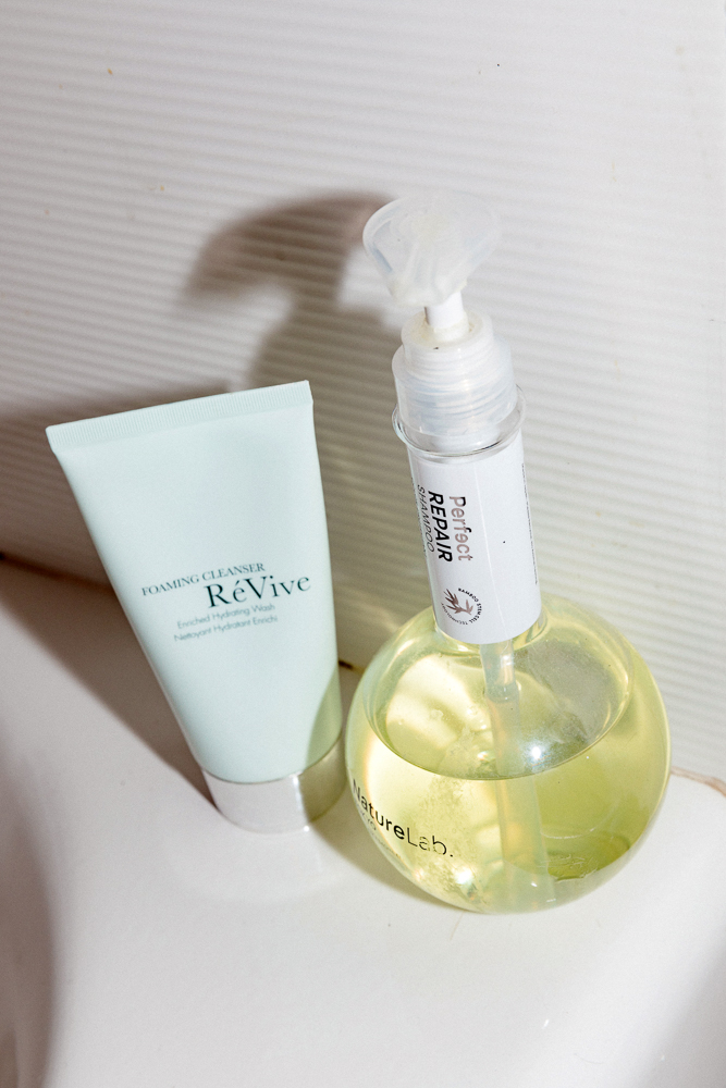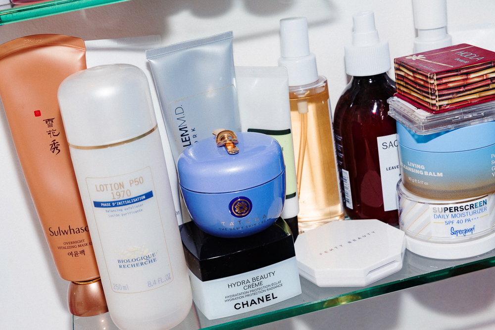 If I have a special event, I’ll get a facial the week of from Sofie Pavitt. It’s incredibly personalized, and she really explains to you what she's putting on your face. She’s also affordable—like $125, which for a New York facial is insane. Then, the night of, I start with a shower. I have such dry skin, and so many products I’d try for a real K-beauty double cleanse would leave my skin too dry. But I started using the Then I Met You cleansing balm—it’s Charlotte from Soko Glam’s other brand—with the Foaming Cleanser Hydrating Wash from RéVive, and it’s so great. I’ll just use the RéVive in the shower to take my makeup off, and Nécessarie in Plain to wash my body. When I get out, while my body’s still wet, I put on a Lavido tea tree cream for my eczema. Then I might pat a little bit of P50 onto my face, depending on what my skin’s doing. A pro-tip is I’ll put on my P50, and then I’ll brush my teeth, or choose an outfit, so I have a little bit of time in between that and other products. Then, usually I’ll do either Biomagic or Masque Vivant, or a sheet mask—I try a lot of them. Today I did the Biomagic mask and a sheet mask from Tula with probiotics. I’ve been trying this new Tatcha Dewy Cream, and I really like it for going out. It leaves a really nice, supple finish that looks so good under makeup. I’ll piano it into my face until I feel like it’s absorbed, and then I’ll hop into makeup.