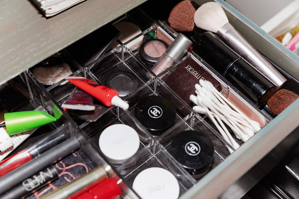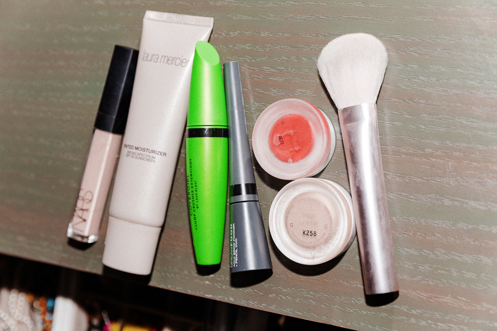 I have makeup that I can do in 15 minutes, 10 minutes, or five minutes, depending on what I’m doing that day. On a day when I’m shooting, it’s 15 minutes. Five minutes is when I’m running around that day, and it’s no big deal. On a day that I decide to put on a little makeup, I start with the Blemish-less Foundation Primer. I’ve been using the Laura Mercier primer and tinted moisturizer together for a bunch of years, and I’ve found nothing better. It’s just so light, and it really evens out my skin tone. I’m shade Porcelain. Then I’ll wear a little concealer, the Nars Radiant Creamy Concealer in Vanilla. I use a Beautyblender for my concealer sometimes, and I like it because it pulls off excess [product]. Then, I really, really like the RMS Lip-2-Cheek, which I use as blush. This is Smile, and I like it because it also feels like performance makeup. I read a tip that said to never put blush below your nose, because it ends up looking ruddy. So I just put it on the apples of my cheeks. A tip that I picked up from watching Eva Chen’s Instagram stories is to put on the Laura Mercier Translucent Powder with a smaller brush. This is a Glossier brush, and I just use it in spots where I get shiny, like between my nose and mouth, and on my chin and forehead. And then it’s not a super matte look.