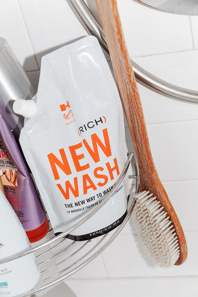 My hair is dry, and I’m trying to replace a lot of my products with stuff that feels more natural, and less chemical-y. I replaced all of my shampoo and conditioner with New Wash. It’s very expensive, but a little goes a long way and I love the smell. Sometimes I’ll put product in after I wash, but most of the time I’m running out of the house and I don’t even bother. Today, I used a hairdryer. My hair is naturally wavy, so on shoot days I’ll do a blowout. I use a round brush, and this really old but effective Twin Turbo 3200 something. It’s old! The key to a blowout is strong arms, which I don’t really have. And just making sure it’s super, super dry, because of the humidity. But I think the real key is not drying your hair all the time, so it responds well.