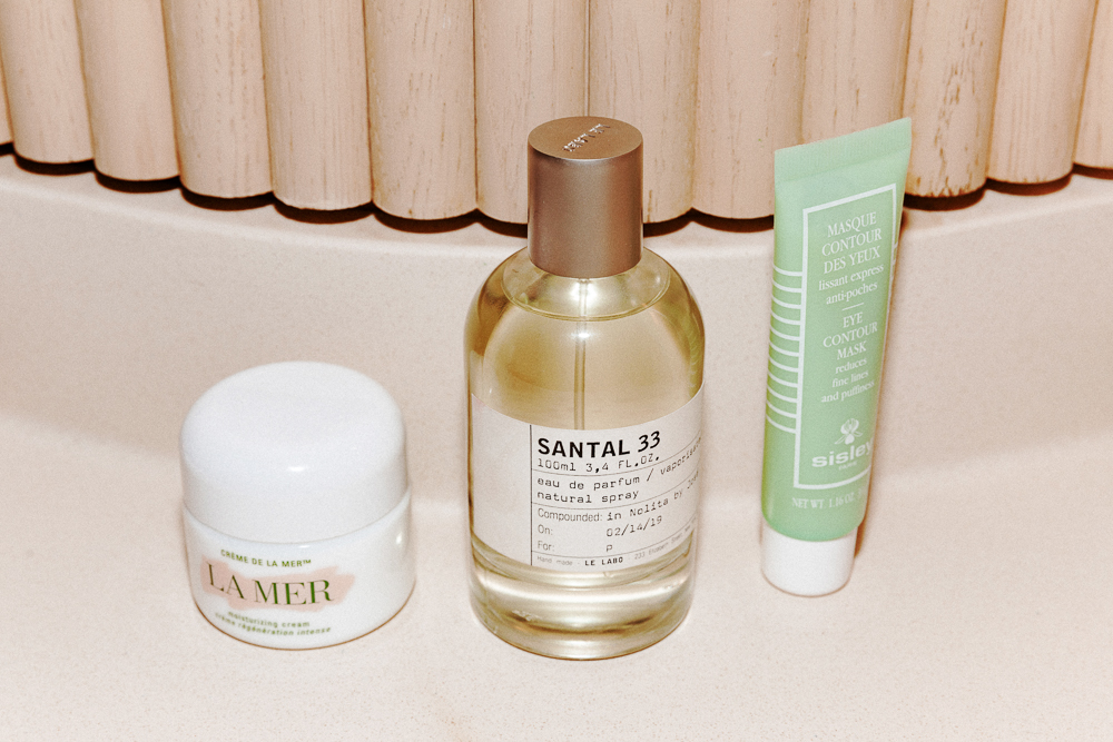 For fragrance, I use Santal 33, or I’ve also been using Mojave Ghost by Byredo. I have quite the arsenal of fragrances. Scent goes straight to the pathways of the brain, and scent is so linked to memory. They’re very specific, sentimental things. When I feel like starting a new chapter in my life, I switch scents.