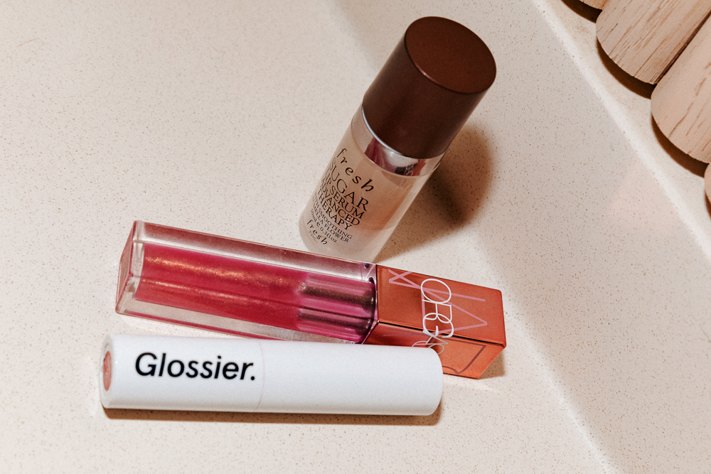 Obviously I can’t do eyeliner. I’ve completely given up on it. But I also find that it makes my eyes look strange, or somehow not like my eyes. I do love mascara, though! I have pretty naturally long lashes—thank you, mom or dad—and I like a chunkier mascara most of the time. A little Twiggy. I’ve been using the Nars Climax and Yves Saint Laurent’s Shock. For lips, I swear by Glossier’s Generation G in Zip. It’s honestly the best lip stuff I’ve ever used—I don’t travel without it. It’s a nice sheer matte and it’s not drying at all. And if I want shine, I like Orgasm Lip Gloss—it’s a nice, oily lip.