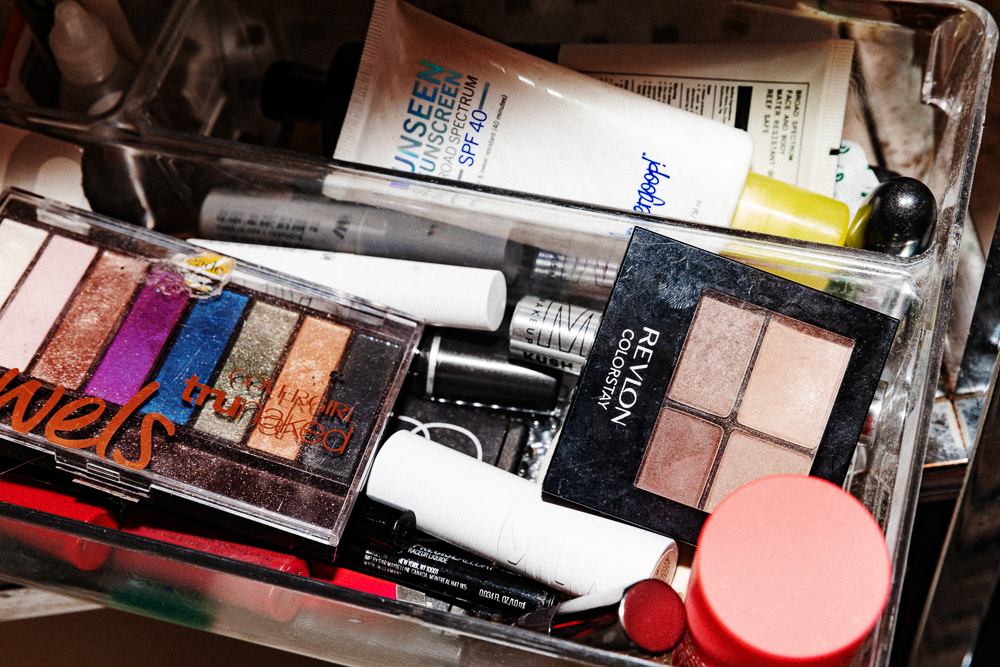 Then, of course, what I feel naked without is my liquid cat-eye liner. I just picked this Maybelline Master Precise All-Day Liquid Liner up at the drugstore one day and I didn’t think the brand mattered, but then I tried a different one that was much worse. It’s super thin and very black. I really liked Too Faced mascara, but I was on set and a makeup artist said L’Oreal Voluminous Lash Paradise is the same thing, but way less money. So now that’s what I use. If I want to play around I love to do a red lip. My dear friend Stephanie Styles, who just made her Broadway debut in Kiss Me Kate, got me a tube of MAC Ruby Woo years ago. That’s my favorite—it’s the perfect blue-red. If I want a red lip and I’m performing, I’ll use Rimmel London Play With Fire. It stays on for like seven months—you have to scrape it off. Every once in a while I’ll be into a dark lip, and for that I like this Nars Audacious in Liv.