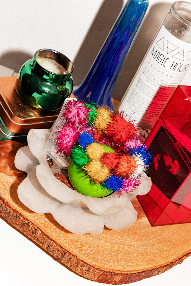 When I’m performing I don’t use foundation—overall I like keeping it natural, except for the eyes. Then it’s more playful—I don’t want to look stiff, I want to look vibrant and interesting. I’ll do a little Nars Radiant Creamy Concealer under my eyes. I feel partial to Nars for some reason. I also really like Milk. I put their highlighter, Lit, on the high points of my face, and I’m obsessed with their lip and cheek thing—this shade is Quickie. I feel like it looks so perfect. My lips get colorless sometimes but this barely looks like I’m wearing anything. I put some on my cheeks, too. The Bubble Kush lip balm also gives you a little color, and it smells expensive.