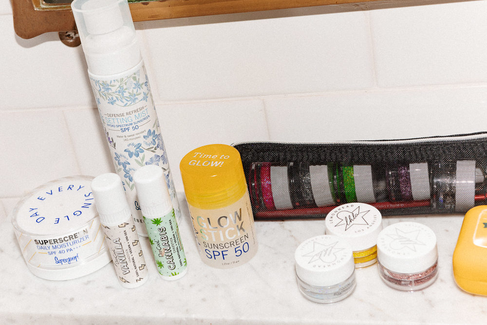 Now that I don’t test products for a living, my routine is less of a revolving door. At night, to take off my makeup, I’ll use the Glossier Milky Oil. I used to be a big face wipes person, but a dermatologist once asked me to think about all of the preservatives it takes to maintain that moisture in the cloth, and I stopped. I’ve been using a Skinceuticals cleanser, but I’ll also use Cetaphil—that’s totally fine. When I stay at a hotel, a lot of the time I’ll just use a washcloth. I love Moon Juice. I really do. I don’t know what would make me stop using Beauty Shroom—I’ve been using it for like a year. They also have a serum that I really like as well. I do try different vitamin Cs all the time—this one is from Allies of Skin, and it’s in an airtight pump rather than a dropper. I don’t like cream as a texture, so usually I just moisturize with oils and serums. It works for me. I like all the Biossance ones—they have a tea tree oil and a vitamin C oil, and I like their oil face wash as well. Their stuff has agreed with my skin. I also use the Supergoop Glow Stick sunscreen, which is completely clear. A lot of people ask me what sunscreen won’t leave a white cast—if you like looking shiny, this is the best. I’m really diligent with it.
