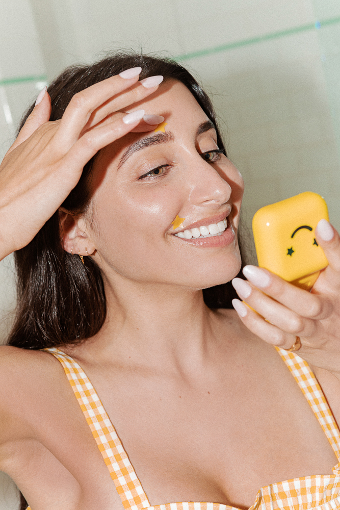 After working in beauty for so long, I still had the same kind of acne as I do right now: never not two or three pimples, regardless of really good dermatologists, a ton of education, and access to every product. This is just how my skin is, and I’m fine with it. Acne is literally the most common skin concern in the United States. How to get rid of acne is always the most Googled question, followed by how to get rid of acne scars. And people were always asking me if products would break them out. I had this idea to make decorative hydrocolloid acne patches in 2015. Hydrocolloids are super inclusive both price and skin sensitivity-wise, and I thought making them cute might take away some of the shame and sadness that’s associated with acne. I had no idea where to start, so I cold-called manufacturers. That’s not how you do it. [Laughs] But I didn’t know what else to do. I’d ask friends in the industry what manufacturers they went with, and one person would lead to the next, and ultimately about a year or so later I met the person who became my business partner. Each pod has 32 acne patches, and you can order refills that come in a sterile pack. The perfect scenario is you put it on one of those big white ones, which would be fun to pop but you resist the urge. You go to sleep, you wake up and the big white thing is gone with no mark. Obviously the design and everything was done before Euphoria and Detective Pikachu came out, but I feel like if they had a baby, Starface would be it.