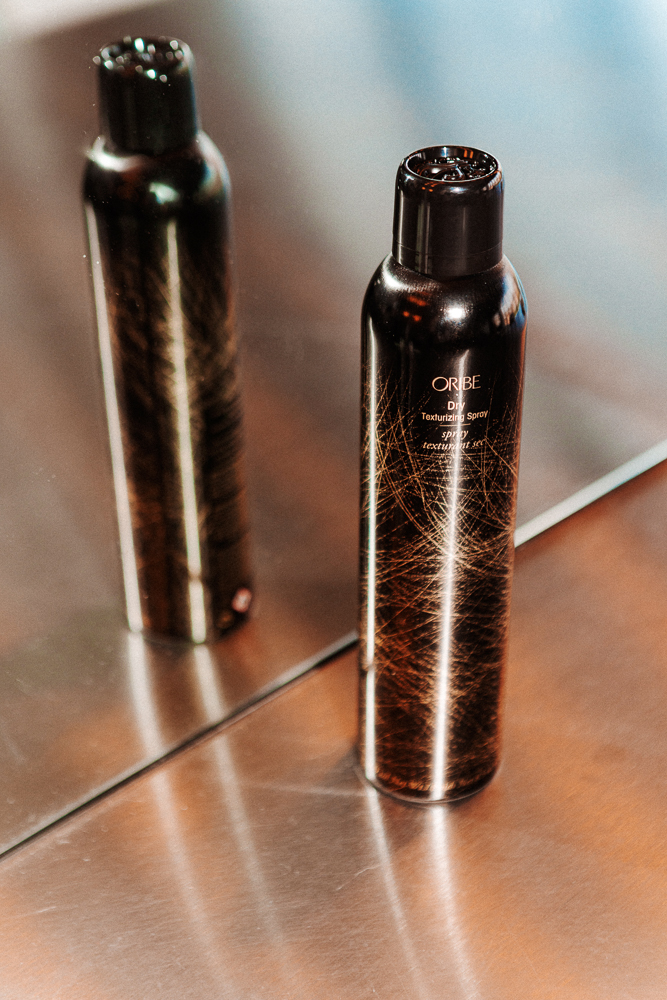 I have a lot of hair, but it’s very fine. When I was growing up, it was pretty much like this—blonde, straight, always darker underneath. It’s a little wavier now after being pregnant, and when I first moved east it started growing in darker. I pretty much always blow dry my hair because it’s way too wavy without it, but it only takes five minutes. I just dry it, and then I use a flat brush. I hate first-day hair—sometimes it’ll be too straight, and I’ll put it up in a ponytail or use the Oribe Texturizing Spray.