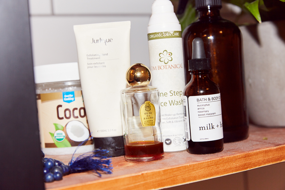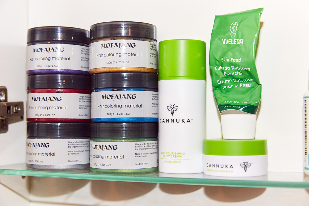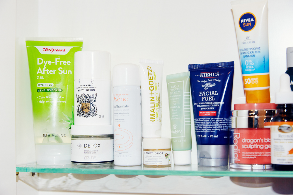 Tattoos are a big part of my life. A big part of my family’s too—it was a tradition that we all got tattoos at 16. My first was something with Chinese characters because it was the early 2000s, but I’m getting it covered soon. It’s supposed to say ‘health,’ ‘wealth,’ and ‘happiness’ on my back, but once I was at the pool with my ex-girlfriend and her grandma, who is Chinese, and she said that the ‘wealth’ is actually an ancient symbol that means your sex life will be abundant and therefore you will be wealthy. [Laughs] That’s not why I’m getting it removed, though. I’m not Chinese, we don’t need that on my back right now. I also have a tattoo of my grandma—she’s a fucking asshole, let me tell you, but I love her. I put sunscreen on them when I remember to, but more regularly I use coconut oil and aloe. This aloe is from Walgreens—I was so upset because I wanted an organic aloe, but nobody makes it. What I should be doing is getting an aloe plant. I also keep an antiseptic in the shower, because I’m always getting tattooed and it’s good to clean them if they’re fresh. I’ve gotten like 12 tattoos in the past four weeks. I need to calm down.