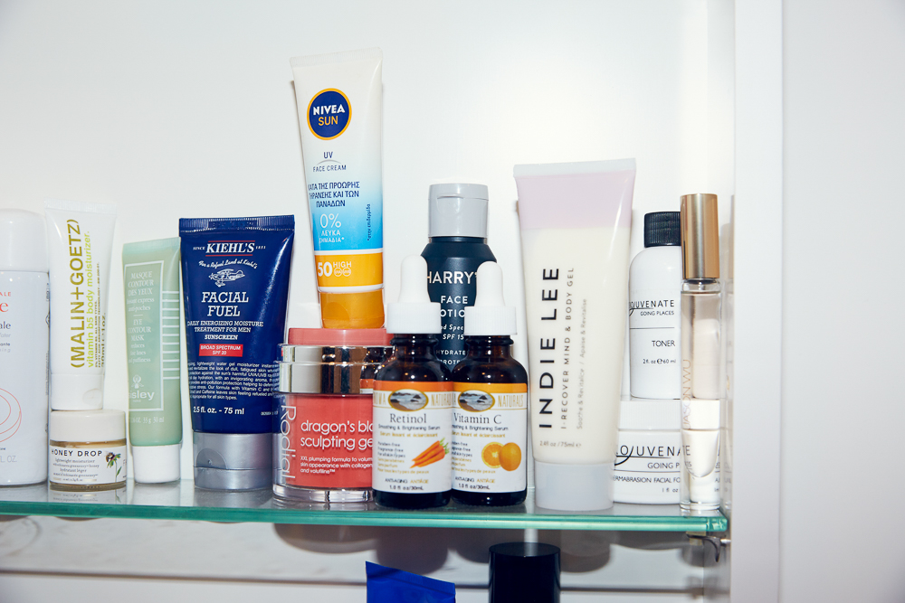 My skincare routine is the type of thing where sometimes I’ll use face wash, or sometimes I’ll use hand soap. I’ve always had really great skin and it annoys the fuck out of [my partner] Bethany. We got married and moved in together last year, and sharing a bathroom changed my skincare. I think a little smudged eyeliner is cute, especially when I have an event the next morning, but they won’t let me go to bed with any makeup on. Realistically, I’ll use anything in the shower as a face wash. I have this Kiehl’s Facial Fuel which I’ve been using, and sometimes the Ultra Facial Cleanser lives in the shower. I also have a Joanna Vargas vitamin C face wash that’s really great.