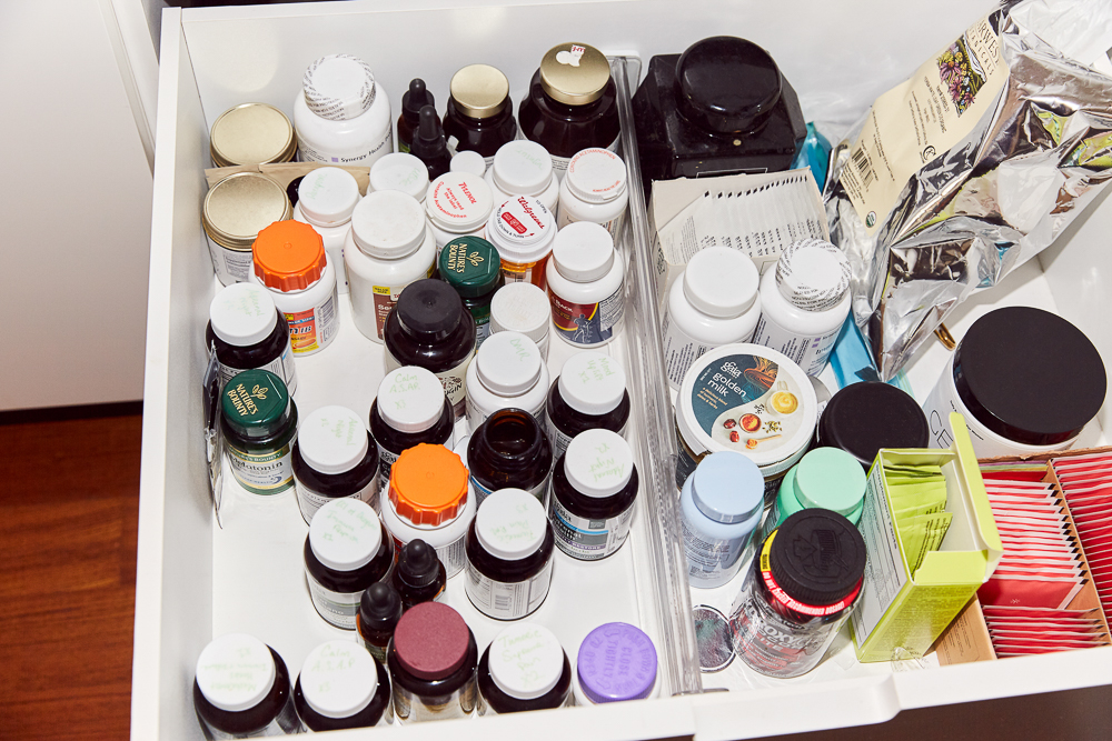 Let’s go to the good shit. Gaia has been everything. The things I take every single day are turmeric, adrenal health, gem maca powders, chlorella and spirulina. I’ll heavy dose those last two every day—like, a handful of pills. It’s straight sun-sourced algae, and it helps regenerate your cells and keeps you really healthy. Oil of oregano and olive leaf are both for immunity, but if I’m feeling a little sick or have a sore throat, I’ll hit the oregano. The olive is more preventative. I like kava root if I’m stressed out, and obviously melatonin if I’m going to sleep. Ginger, obviously, is great. Starwest Botanicals tea is also great. It’s all organic loose leaf that you can get from Amazon for super cheap. The maté is for a pick me up. Upstate I have a lot more teas. I take massive amounts of superfoods.