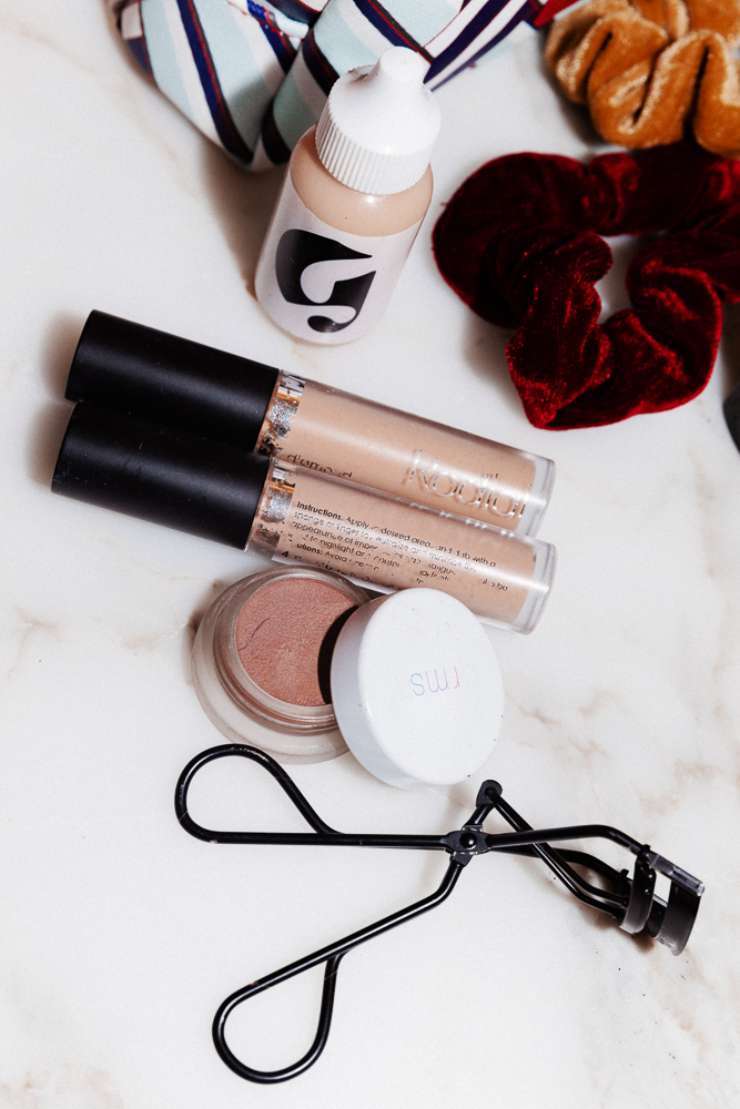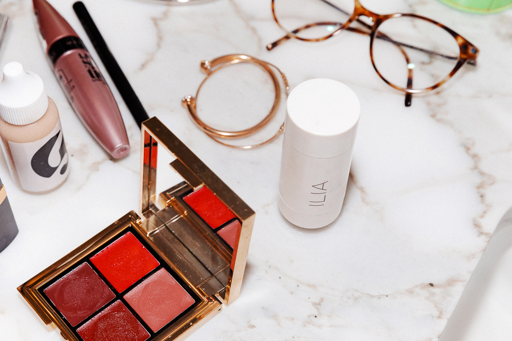 I use the Rodial Diamond Concealer everywhere—I start in the center of my face and then I blend it out to get a lot of coverage. I have shades 20 and 30, and I’ll mix them depending on my color. For something lighter, I’m obsessed with Glossier Skin Tint in Medium [ed note: now called shade G9]. I have the Estée Lauder Foundation Brush 1 which is helpful, but to be honest with you, I always forget my brushes and end up using my fingers. I never powder myself unless I’m having photos taken, like when I’m going on the red carpet or something. This is a very good one, from Ilia—you press it, and powder comes up, and it’s very sheer. I use RMS Buriti Bronzer on my jawline and my cheekbones—I have a very strong jaw, and I know I look better when I don’t put my chin up too high. The bronzer helps, too.