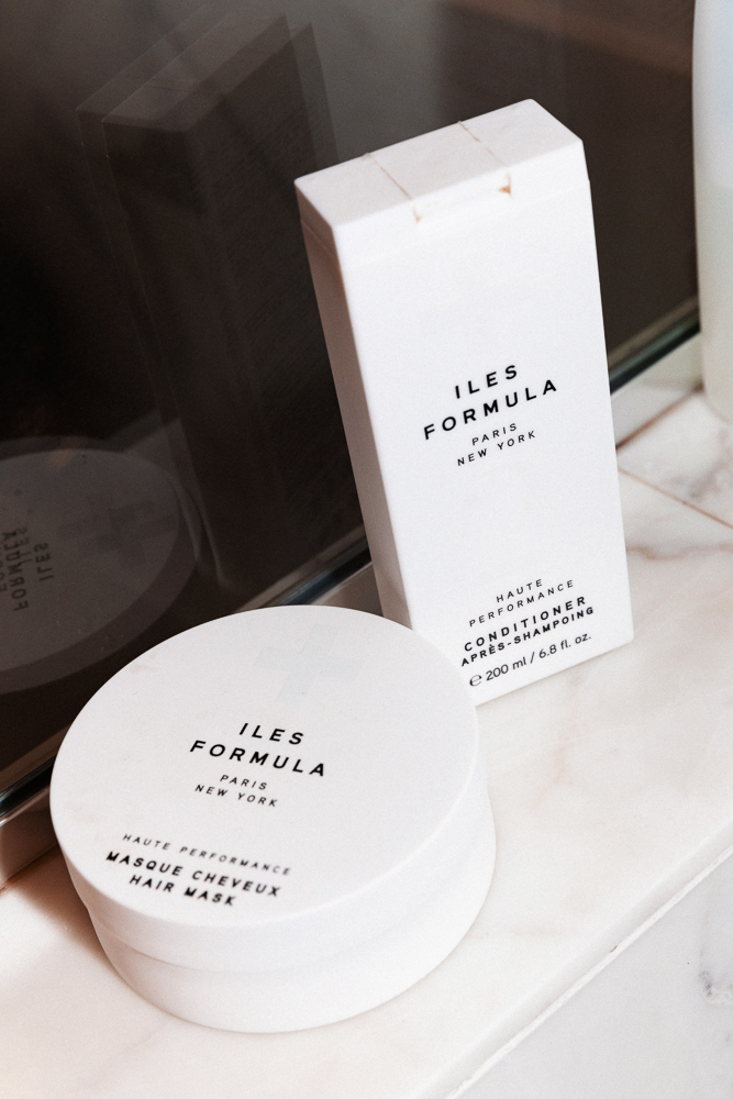 My hair is naturally curly, and I don’t brush it. When I do, my curls become very frizzy. I also have really dry hair and I have to wash it often, unfortunately, because I work out almost every day. But I’m obsessed with this brand called Iles Formula. I use the shampoo, the conditioner, and the serum, and I use the mask once a week. It makes my hair so soft. I try not to use a hairdryer, and some days it looks great, but other days it doesn’t. If it looks bad I use the serum, because it helps make everything a little smoother. If I want it to be straight, I never use a straightening iron—always a blow dryer. It looks much prettier when I do it with a brush—with a straightening iron, it just looks dead. For a curl I have curling irons, but I don’t do it perfectly. I just put my two mirrors up so I can see the back, and I curl a few pieces—not everywhere. I love the Klorane oat dry shampoo, and I have a really great texture spray from Balmain. I would not use it for a daytime thing—if I go out, then yeah. It’s not very nice when you touch your hair because it has a very strong hold, but it’ll give you a look.