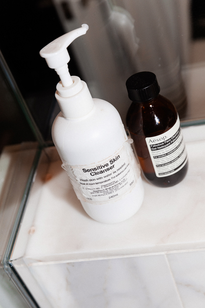 In general I have dry, sensitive skin. I always wash my face in the shower. For a simple cleanser when I’m wearing makeup, I like Icy Falls from Valmont. I use it on dry skin like a cream, and then wash it off in the shower. If I’m not wearing makeup, I like the Carrot Butter Cleanser from The Organic Pharmacy—it’s a little stickier so it doesn’t take off makeup well, but it’s a great cleanser. I don’t use a toner. OK, I’m lying—I have used Kiehl’s Calendula Toner, but only when my pores are clogged, or I have rosacea. My dad taught me all about rosacea. I call him every day like, ‘What do I do?’ I actually use an antibiotic treatment from the dermatologist for my rosacea called Doxycycline. At first, I just had ocular rosacea—it’s not fun. You have the sensation of a hair being in your eye all the time. It was awful. I kept going to the opthamologist saying, ‘I know I have something in my eye, please look,’ and it was nothing, nothing, nothing. Then I started to get rashes and they knew it was rosacea. The antibiotics help.