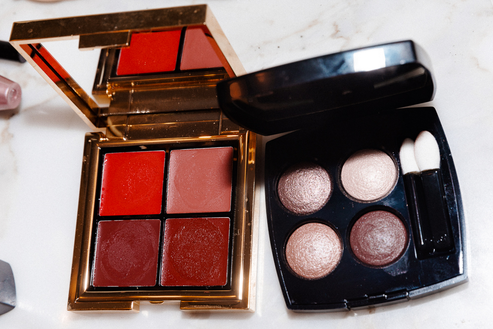 Because I don’t want to have to maintain my lips all night, I usually just do my eyes. I have this taupe shadow from Nars that looks really nice with blue eyes, but I left it France. This weekend I used the taupe from Chanel's Les 4 Ombres Tisse Rivoli instead, which is more purple-y. I like it because you can barely see it in the evening—it just gives you some shade. I always apply it on the outside of my eyes and blend it into the inside, which gives you more of an almond shape. Le Metier de Beaute liquid liner is good when I want to do a cat eye. My light taupe-y shadow, a great mascara, Boy Brow, and that’s it. I have Maybelline Lash Sensational mascara, but the one I like the most is the one from Jessica Alba, Honest. I always use it with an eyelash curler. Honestly, every time I’m on set the makeup artists have these great eyelash curlers, but when I buy them they don’t work as well. Maybe it’s me. If I do use a lipstick, I love this palette from Rouje. I put it on with my fingers—I’m really bad at putting on lipstick, and I never have a problem with those. Tromborg Lip Cure is the only thing that doesn’t dry out my lips—Homeoplasmine on my lips is never a good idea. I was talking about lip dryness with my Danish friend, and she told me about the brand. I’ve already finished two.
