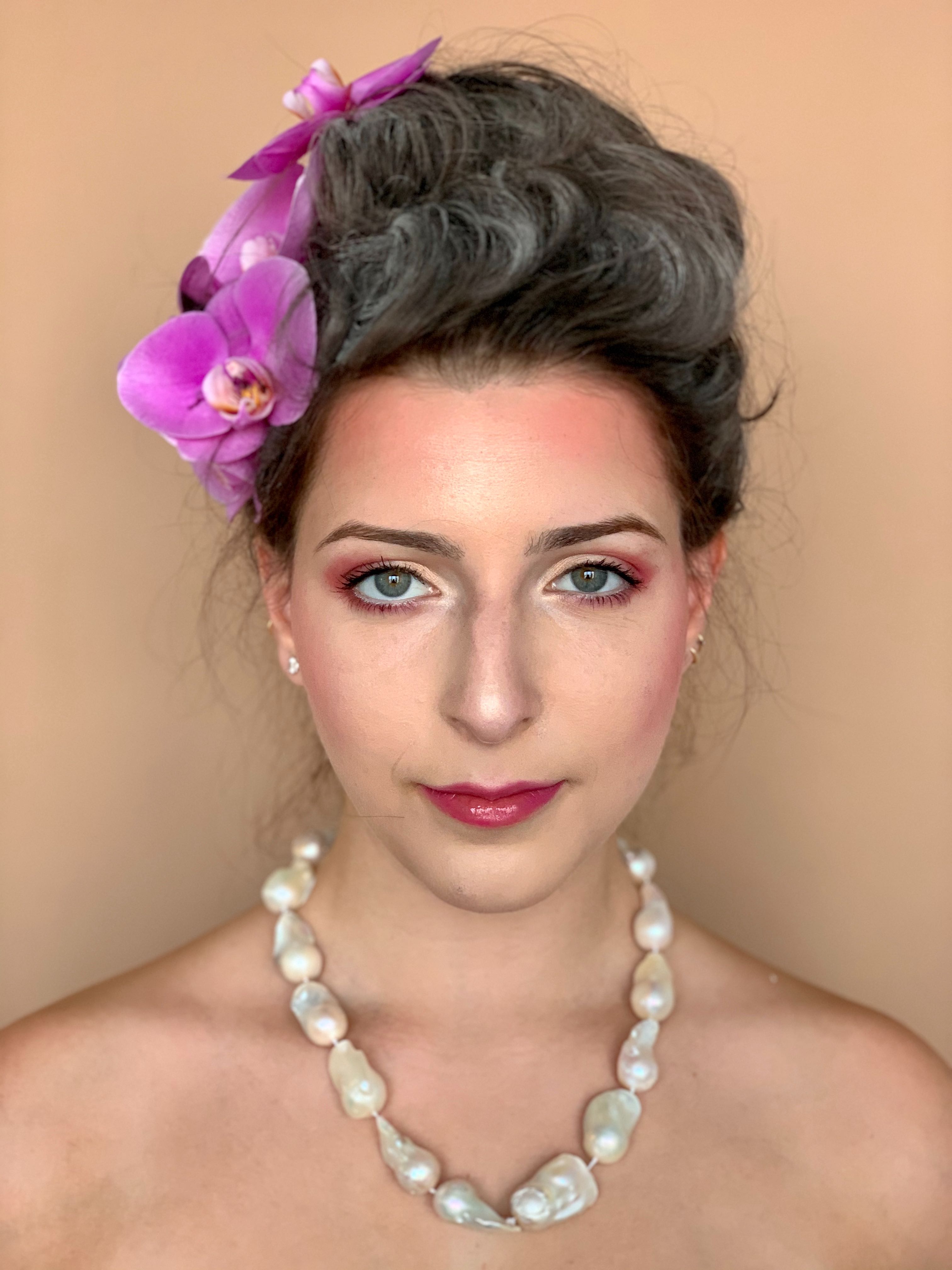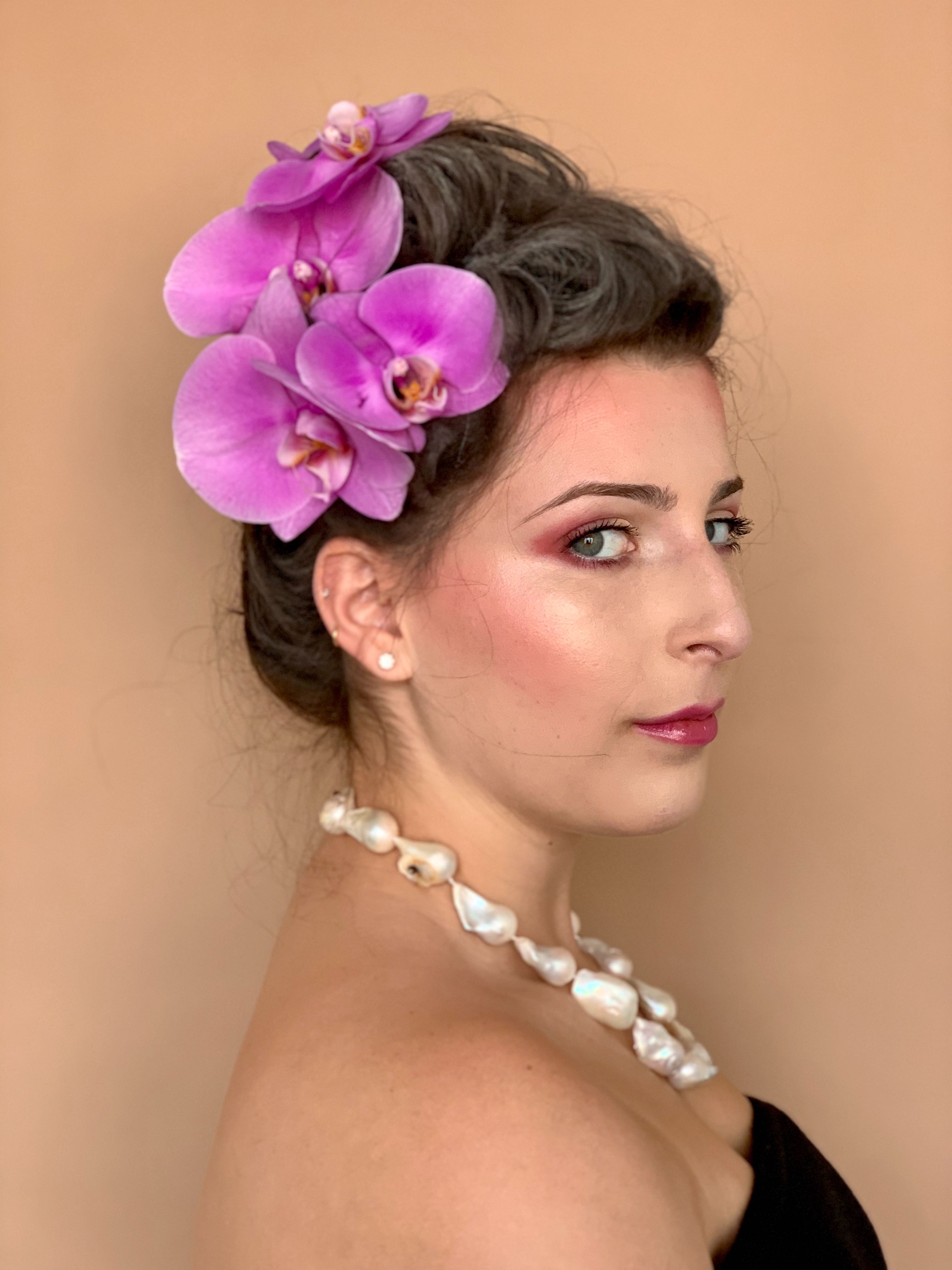 To get the volume in my hair, I followed the method from this YouTube tutorial. Basically, you’re going to take a chunk of hair from the crown of your head, braid it, and twist it into a bun. You put the bun donut on that braid nub, and wrap it in the extensions. Next, curl your hair all one way with a small curling iron, spray it with hairspray, and begin pinning it up on top of the bun. Don’t pull so tightly or the little waves from your curls won’t be visible. Lastly, spray all over with dry shampoo to get a powdery, wig-like look. Bobby pin in some orchids for drama.