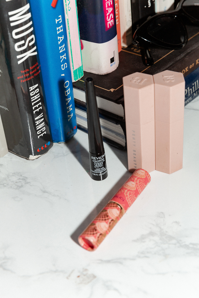 I rarely wear eyeshadow but I do love Revlon Colorstay Liquid Liner, which I think is the easiest to do a cat eye with. And then I use Milk Kush mascara. They told me it will make my eyelashes thicker, and I believed that because I’m the most gullible consumer. But it does make my eyelashes look really long—I look like a camel. I use the Milk brow gel, too. For lipstick I love Tarte—Nude is fantastic and I swear by Yachting, a dark purple, brown-ish one. That’s the kind of color my mother always wore, if she wore any makeup. Woah—I’m becoming my mother.