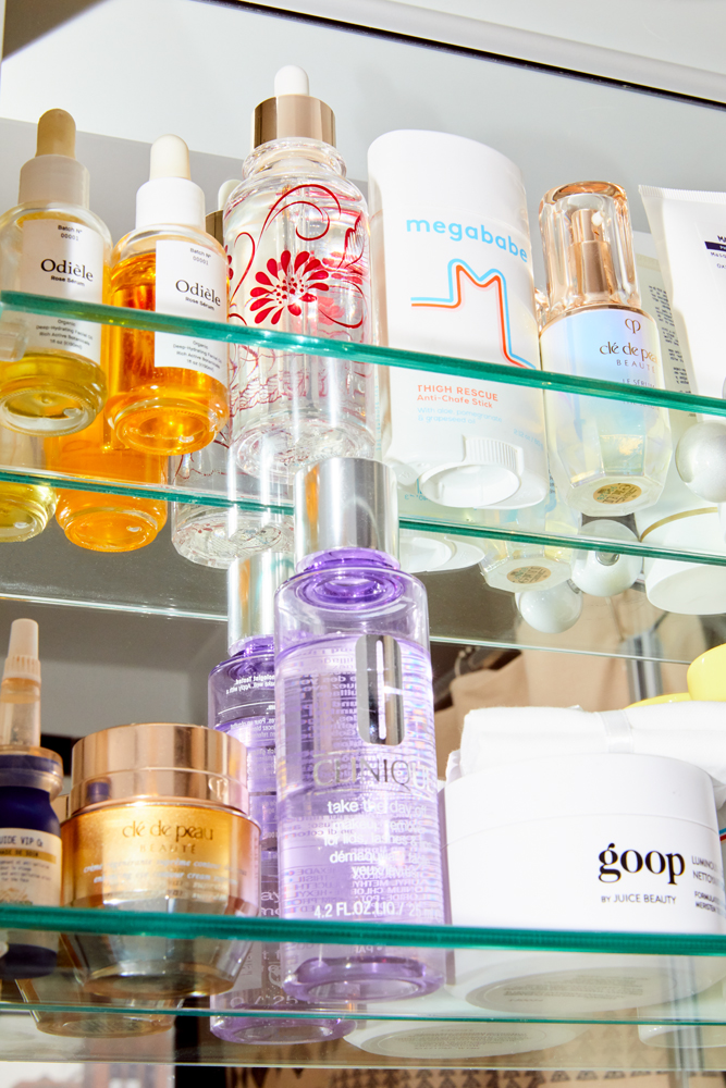 I had acne flare-ups until I was in my late 20s—I took the pills, I did the whole thing. Finally, my skin cleared up. Now, I just want things that work. Say what you want about Gwyneth, but I use and love a lot of her products—and I’m not paid to say this! In the morning, I’m really into the Goop G. Tox cleanser, and the Melting Cleanser is my end-of-day wash. I’ll take my makeup off with a cotton pad and Clinique Take The Day Off, wash with that, and then do some kind of exfoliation. Most of my skincare is trying to aggressively exfoliate at all times. I use the Goop Glow Pads once a week, because that’s what they say to do, and the Instant Facial is amazing too—it rips your damn face off. When I’m feeling lazy, I use P50 1970. The thing I use most consistently is Augustinus Bader—sometimes it’s The Cream, but usually it’s The Rich Cream. I don’t know what it does, but I look amazing. I was told I don’t need to use anything else when I use that, but of course sometimes I do. I sometimes use the Elizabeth Arden retinol capsules, which I like because they stay super fresh and active. And then I finish with Clé de Peau Créme Regenerante Supreme, which is an eye cream, and the oil from Odelie—I’ve tried some very fancy oils that we all know about, and I prefer this.
