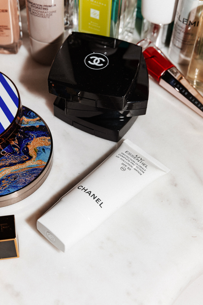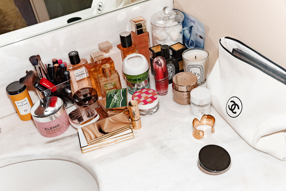 To cleanse, I use the new Elemis Pro-Collagen balm. It smells like rose, and I love it on wet skin. I think Elemis makes some of the best skincare of all time—the company invests so much in research, and you can tell. I’ve been to the House of Elemis in London so many times. After cleansing, I use the Rose Micro-Lotion from Dior. I’m trying to make a whole routine that smells like rose—the scent makes me feel very calm and positive throughout the day, and I don’t have any problems with fragrance. Then I use Shiseido’s Power Infusing Concentrate. Absolue Lancôme is my day cream, and at night I use the Estée Lauder Night Repair. It actually works—when you wake up, your skin is plump and moisturized. Otherwise, I really like the Greek Yoghurt series from Korres. For my eyes, I use La Prairie. My favorite SPF is the Chanel Essentiel—in Greece we have so much sun, and it’s easy to get wrinkles. I don’t want cosmetic surgery, and I’m really focused on aging beautifully and naturally.