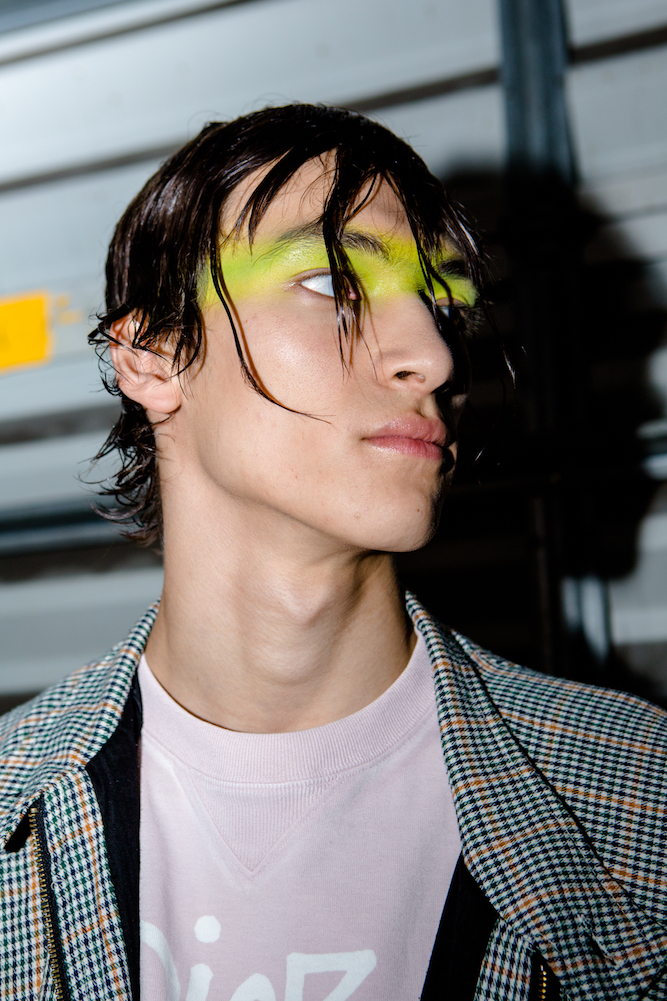 Hats are what I usually wear when I’m not wearing makeup, or when it’s sunny or cold or somewhere in between. However, say you’re really into hats and makeup—what’s the solution? A little eye makeup gets drowned out. The answer is to go big, and in Dior’s case, green. And then extend that shadow beyond the eye and make your way up and out. Philips took a Temptu airbrush, and after prepping the skin with Dior Backstage's Face & Body and Derma Shield, spritzed a layer of lime green from ear to ear. Without the hat the look was bold! In-your-face fluorescent green. But paired with a wide brim it felt more muted and yet definitely there. The effect relayed something like: I’m wearing eye makeup, but not overwhelmingly so—fusing the hat and makeup as one cohesive look. Too much to be worn without the hat, the eye makeup depended on its accessory. The best of both worlds, really. The ability to have a hat, and wear your makeup, too.