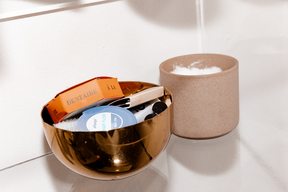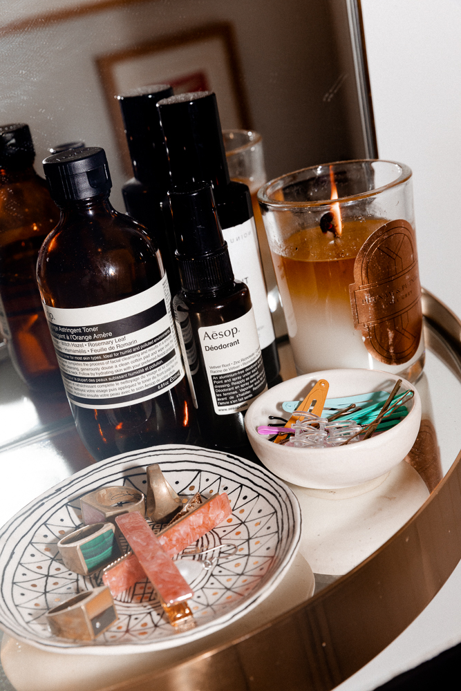 MP: I take longer to get ready in the morning [than Darroch]. I don't wash my hair every day because it's really curly and I don't want to dry it out and get all frizzy. I’ll rinse daily, but I only wash it maybe twice a week, and on those days I use Aesop shampoo and conditioner. They also have a nice scalp oil that I like using before I go to bed—it moisturizes really well. Another great product for hair is the Violet Leaf Balm that Aesop makes. It's super moisturizing and amazing for curly hair. And so is the Ouai styling cream. That's the best.