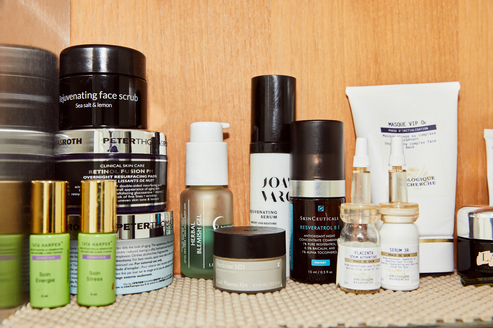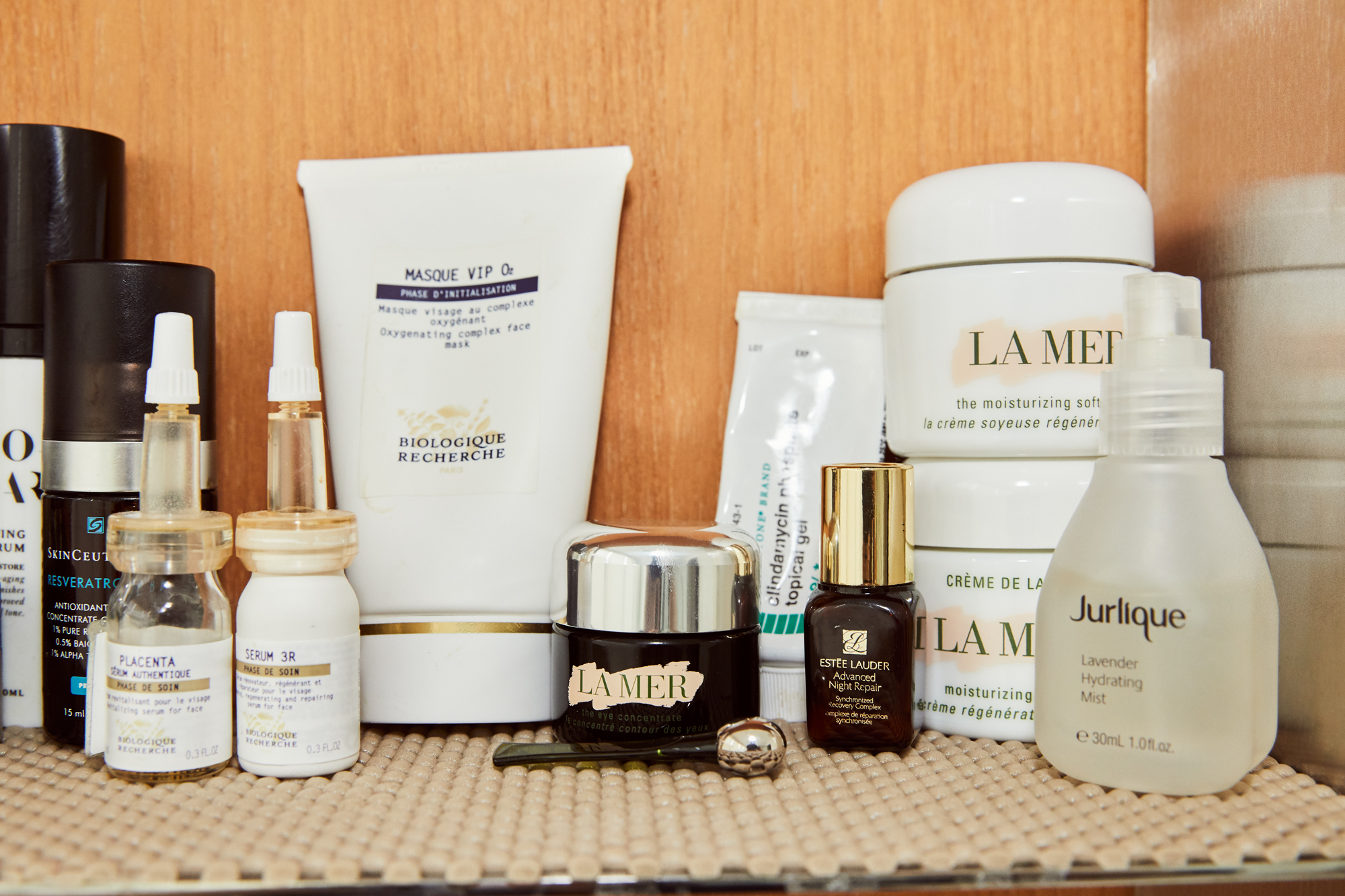 I started going to Rescue Spa, and it has been so helpful for me I can’t even tell you. I deal with dryness because I’m aging, and redness. And right away my aesthetician Alina said to me, ‘You wash your face with hot water, don’t you?’ I did! That was what was causing me more redness. So now I use the Biologique Lait EV soap with cool water. Then I use P50 1970 V, and since I started using it I have not had problems with blemishes. I really am a good rule follower, so I use it twice a day. Afterwards I put this Serum Amniotique on, which I think neutralizes the acid. It makes my face stop tingling. It’s funny, they sometimes give me samples of different serums, and the other night I put one on without really looking at it. My daughter is really sensitive to smell and was like, ‘Wow! You stink!’ I went to check what it was called and it was called Placenta. Maybe that’s... literal? [Laughs] I have the Elastine one too, but I stick with the Amniotique usually. In the morning I follow that with the MSR H cream, and at night the Creme Verte Espoir. I love how it smells like oatmeal—it makes me feel very calm, and nurtured.