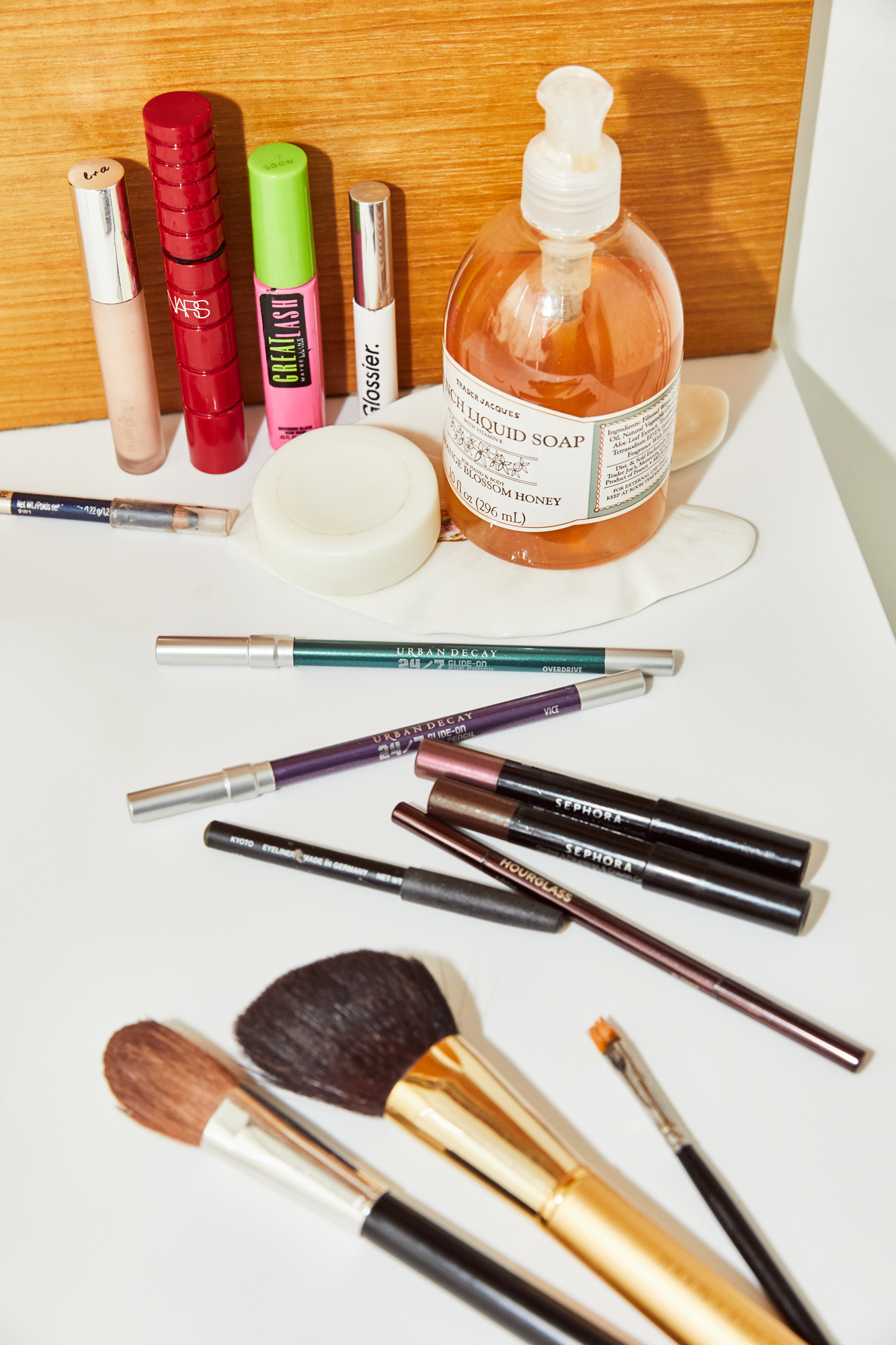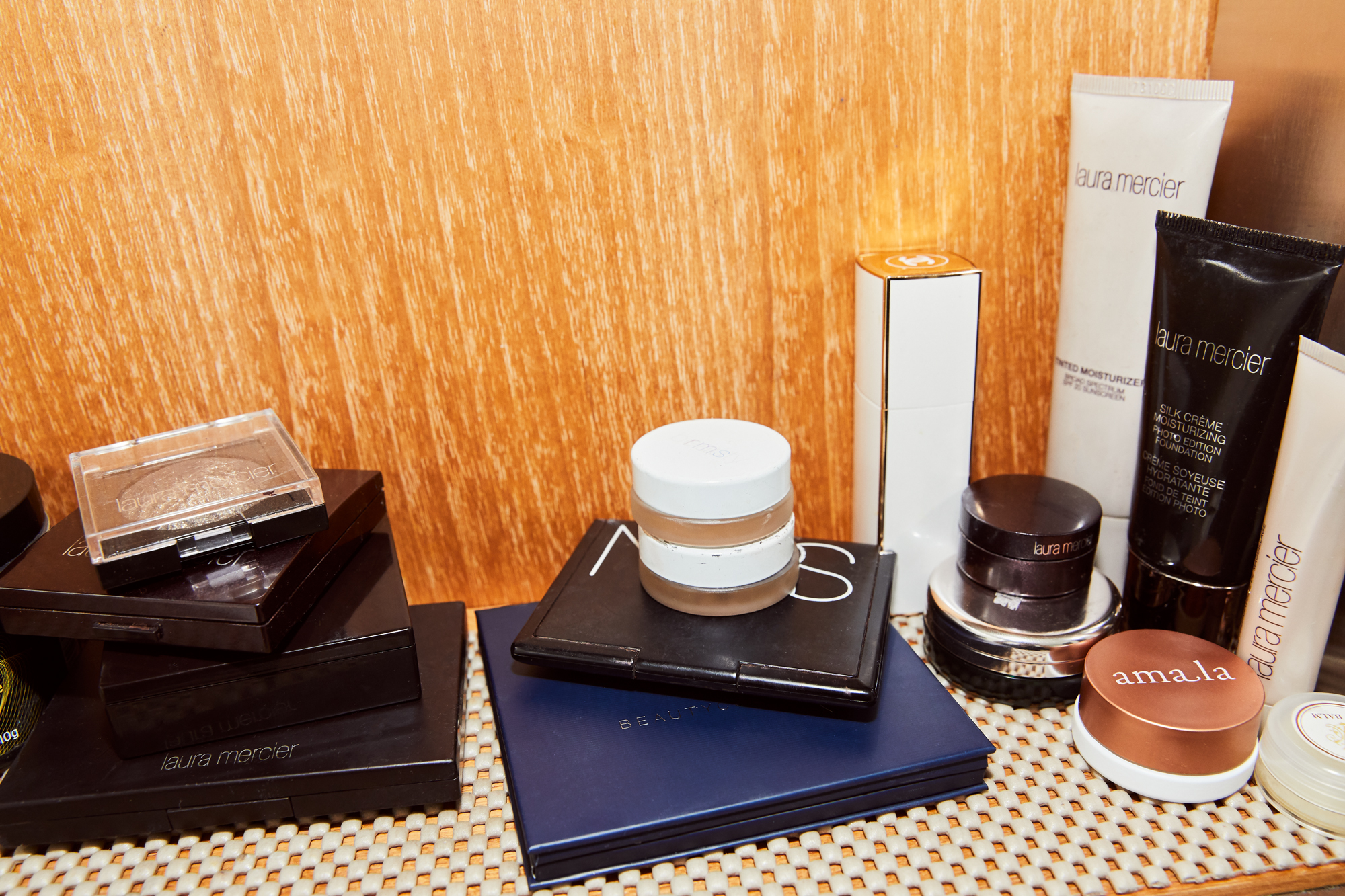 I get the most creative with my eyeliner color. I’m not loyal at all. Every couple months I’ll go to Sephora and pick up colors that look interesting—right now I’m wearing a Sephora Purple eye crayon. I like this Lab To Beauty lip balm, which has CBD in it and kind of tingles on your lips. Then I’ll define my eyebrows, because my hair is getting more gray so without anything they’d disappear. I use Glossier Boy Brow in Brown and an Hourglass brow pencil, but I’m not loyal there either. Where I’m really loyal is with RMS Un Cover-Up concealer. Romy told me to get it, and she was so right. It really helps me. I always put it around my nose, and then anywhere else there’s a red mark.