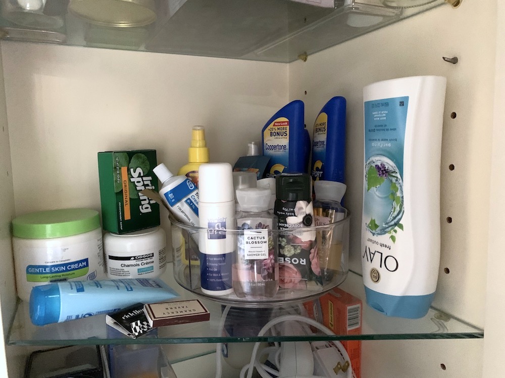 When pulpy crime novelists write about the deep, dark corners of the world, what they’re actually referring to is the middle cabinet in my bathroom. It’s wedged into the corner like it’s hiding from someone. And that someone is you. Here, I stash the products in ugly, clinical packaging and the bottles of slightly embarrassing origin that I can’t live without, but that I can live with out-of-sightline. But I’ll open it today, for your entertainment and maybe also even for your service.