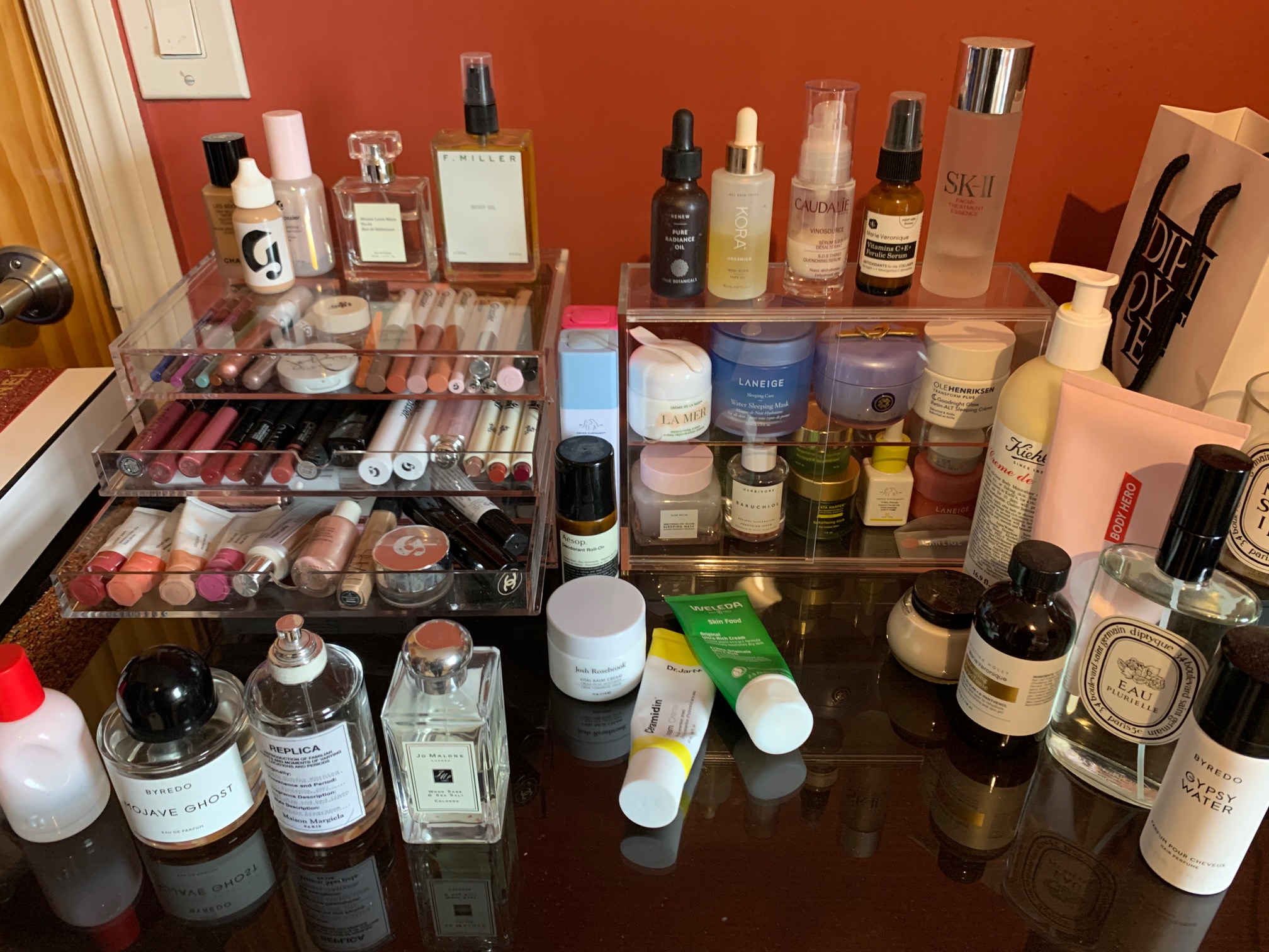 I guess I should admit it: I’m addicted to lip balms, and fragrance… and candles. This #ITGTopShelfie might have to end in an intervention. I have approximately six lip balms on me at any given time, but if I had to pick one, it would be Olio E Osso Balm No. 1. The wide stick glides on so easily, the texture is so silky (it’s shea butter and olive oil), and the subtle lemon and grapefruit notes are just perfect. One stick lasts forever. In terms of scent, the rotation includes Glossier You, Margiela Replica Lazy Sunday, and Byredo Mojave Ghost, but my favorite right now is Maison Louis Marie Bois de Balincourt. Jo Malone’s Body Cream in Pomegranate Noir adds some subtle and moodiness to whichever I pick, and it lasts all day.