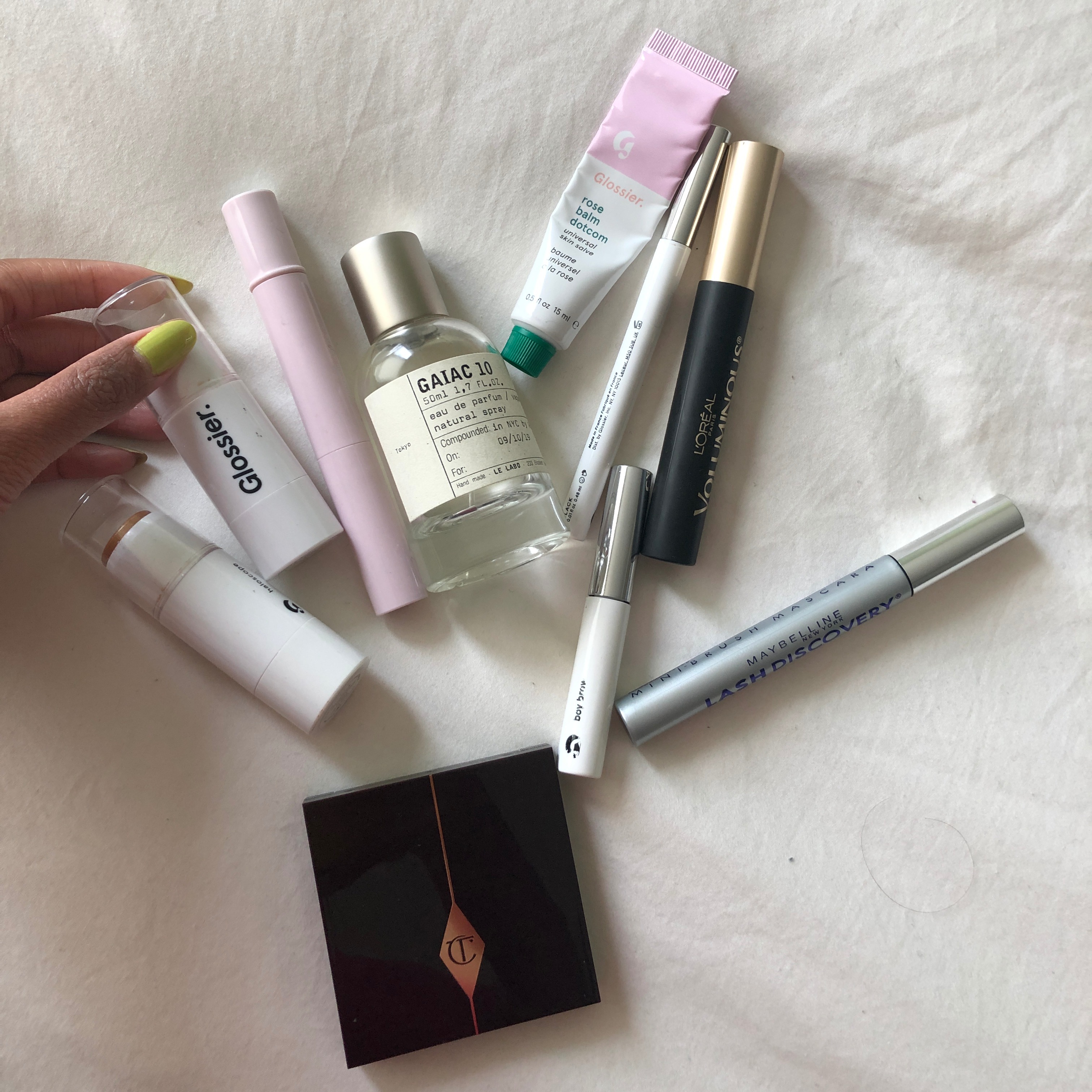 I’m the youngest of four kids, and I was a preteen around the time my siblings started leaving for college. Playing around with makeup was something I could do by myself when I was basically an only child, and even today I approach beauty with FUN in mind. First I do my base, which is pretty much always the same. I did not luck out in the brow department, so obviously I lust after thick, fluffy brows—isn’t that always how it works? I’ve tried everything, but Brow Flick was life-changing for me. The drawn-in brow hairs look so realistic. I add more depth with Boy Brow in Black, and then I love to do a crazy voluminous lash. I’ll start with Maybelline Lash Discovery, which is a bottom-shelf mascara (literally on the bottom shelf at every drug store). The tiny brush lengthens and separates, so it’s a great base coat. Then I do one or two coats of L'Oréal Voluminous on just my top lashes for a doll-like look. Instead of combing the mascara wand from the root of my lash to the top, I keep the wand still and blink the mascara onto my lashes. I find it creates more depth and gets into the nooks and crannies better. After that, I mix Haloscope in Topaz and Quartz in a ‘C’ shape from my cheekbone to under my brow bone. Being glowy is my number one goal in life.