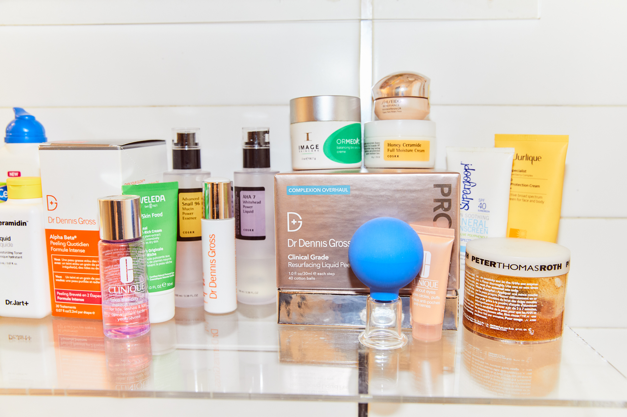 My favorite mask right now is the Benton Snail Mucin mask, and I do the Boscia Luminizing mask, too. I mask before a big event or if I'm feeling lazy and want to stay in. At night I use Clinique's Take The Day Off to remove my eye makeup, and then I'll double cleanse with either the Neutrogena Acne Face Wash or Dr. Dennis Gross. I take it day by day. If she's behaving then we'll leave her. Sometimes I like to use the AHA from Cosrx or Paula's Choice AHA. Then, if I need to, I'll use one of two prescriptions for breakouts—Tretinoin .05-percent and Clindamycin. I use more things in moderation since I started taking Spironolactone [a blood pressure medication]—it takes three months to start working but it really makes a big difference in clearing my skin. After that I'll use Image Skincare Bio Peptide because it makes my skin feel so soft, but it's pretty thick. I don't do a lot of serums, and I don't use oil because I'm scared I'm going to break out. Once a month I'll do Dr. Dennis Gross' Clinical Resurfacing Liquid Peel and it feels like a whole thing, but I love doing it and it really has helped with the hyperpigmentation on my cheeks.