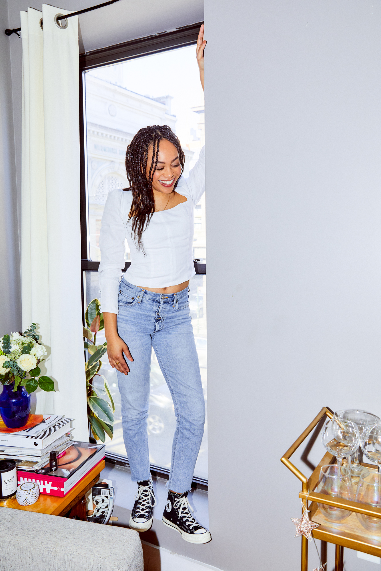 I don't wear fragrance because, as a kid, they used to get me in trouble all the time. I would take my mom’s and close the door and try them out, and I would accidentally drop and break them. Now I go to Primp and Polish for my nails. I always do a nude or a white or a deep brown. The only thing that really bothers me is when my nails aren't all the same length. And as for working out, I don't really do it. I went to a stretch class for the first time at Outer Reach recently. But yeah, I don't work out—I just walk really fast.”