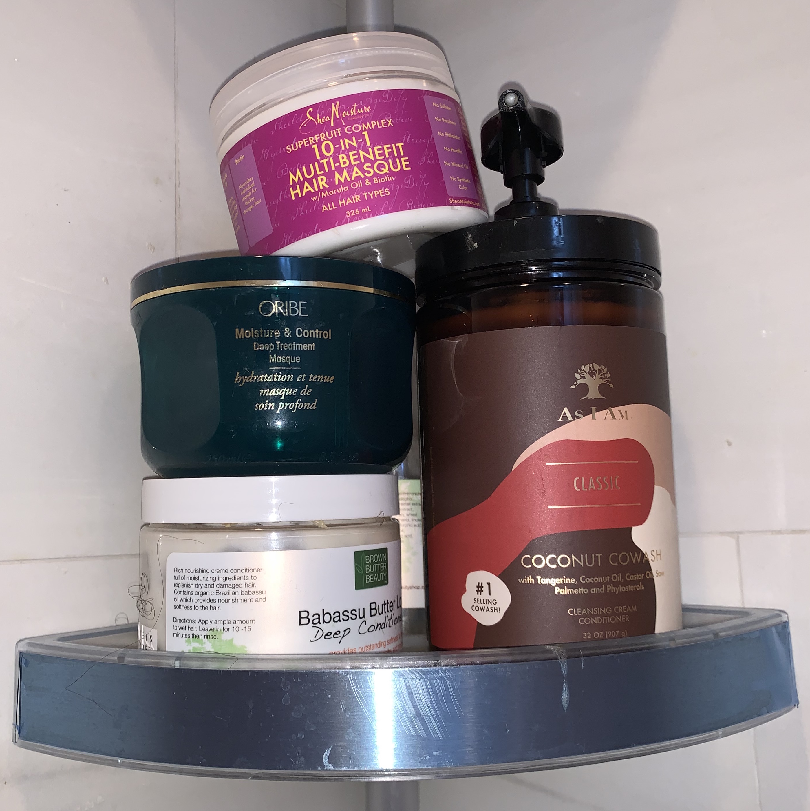 I’m not really a makeup girl, but I am a big-time hair chameleon. I experiment all the time—braids, wigs, clip-ins, natural hair, you name it. My bathroom looks like a beauty supply store! For a wash and go, which is usually how I wear it when I’m staying home, I start by co-washing with As I Am Co-Wash Cleanser or I shampoo with Devacurl’s No Poo Cleansing Conditioner. Then I condition with Shea Moisture’s 10-in-1 Superfruit Masque—conditioning with a hair mask changed the game. Pattern has a great detangling brush that really smooths out my curls. After brushing, and with my hair still soaking wet, I add Camille Rose Coconut Water Leave-In Conditioner and follow it up with Curls Goddess Hair Gel for definition. I get out of the shower, shake the curls into place, and sit under my Conair portable hair dryer for 20 minutes. Then I either let my hair dry naturally or finish it with my blow dryer. Once it’s dry, Jamaican castor oil goes on my edges and Pattern’s Jojoba oil on my strands.