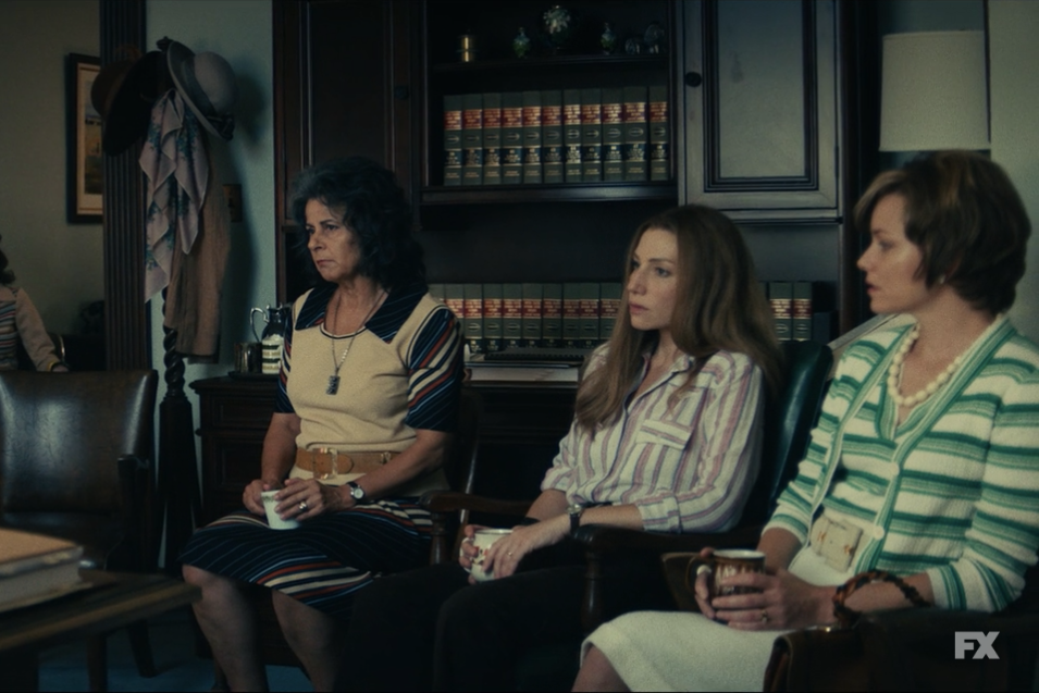 Cate Blanchett’s personal makeup artist Morag Ross designed the makeup for Phyllis Schlafly, but Samuel used photos of the real Schafly to suss out what the makeup for the other Stop ERA women should look like. “You could imagine them putting their purse on their lap, taking out a compact, and press-powdering their nose in a restaurant or in the middle of a meeting,” he explains. At the time, blue eyeshadow was a middle-of-the-road, conservative, feminine shade. “I mean, Barbie had blue eyelids,” he says. On the show the blues were a sheer, sometimes-pearly robin’s egg that was never too deep or bright. “There’s a level of desaturation that really makes something from the 70s look like something from the 70s,” Samuel tells me. “Theatrical makeup wouldn’t work, so a lot of the eyeshadows we ended up using were from the drugstore.” His team bought up blue Covergirl, Maybelline, and Revlon palettes, and stuck to the pale shades. It’s easy to get the exact look at home.