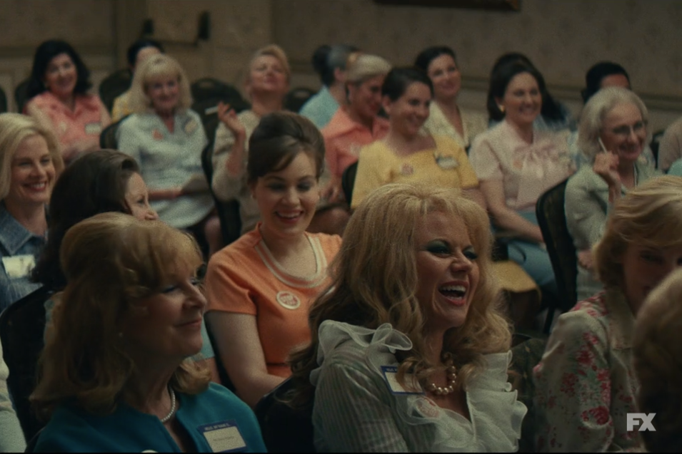 “In designing this whole show, my team and I were really conscious of the distinct visual difference between the ‘pros’ and the ‘antis,’” the show’s lead makeup artist Jordan Samuel explains over the phone. “Nowadays, I don’t think you can necessarily identify what someone’s beliefs are from their appearance,” he adds, “but we definitely wanted to make sure that the audience could tell the difference when they saw the two groups on screen.” He collected research from all the obvious (old makeup ads, magazine tears) and ingenious sources (old high school yearbooks). “You can literally search them geographically, and by year,” Samuel tells me. “You’d be surprised.”
