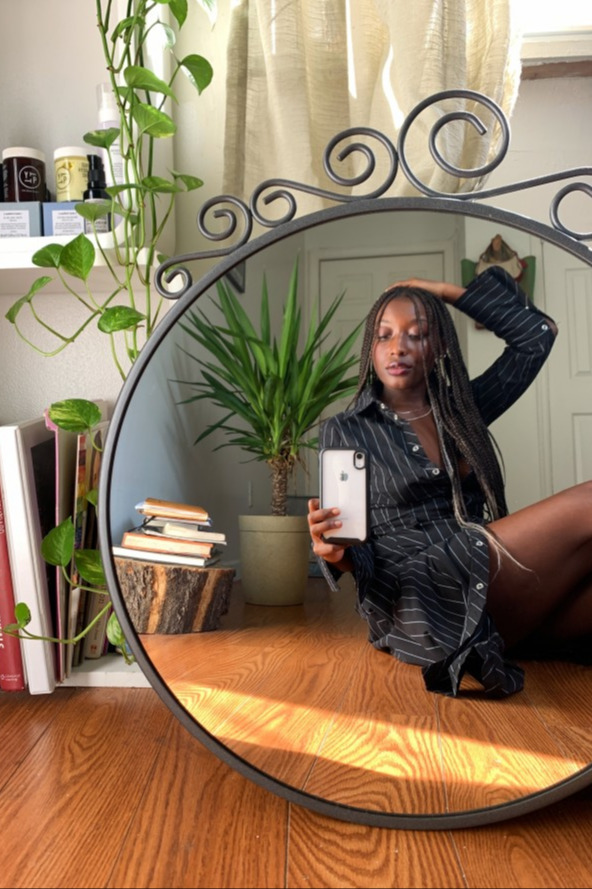 Usually after I’ve completed my morning skin care routine, I’ll go ahead and apply a good lip color or gloss depending on my mood. My go-to was always Glossier’s Generation G in Jam, which gives my lips a tint of color that works for an everyday look. But now that protective face masks are the norm, I’ll focus a lot more on the eyes—I like to apply a little eyeshadow or just mascara to open them up. When it comes to makeup I’m pretty simple, but I’m a woman who loves change—I express that mostly through my hair. I’m at the hair salon often altering my styles.