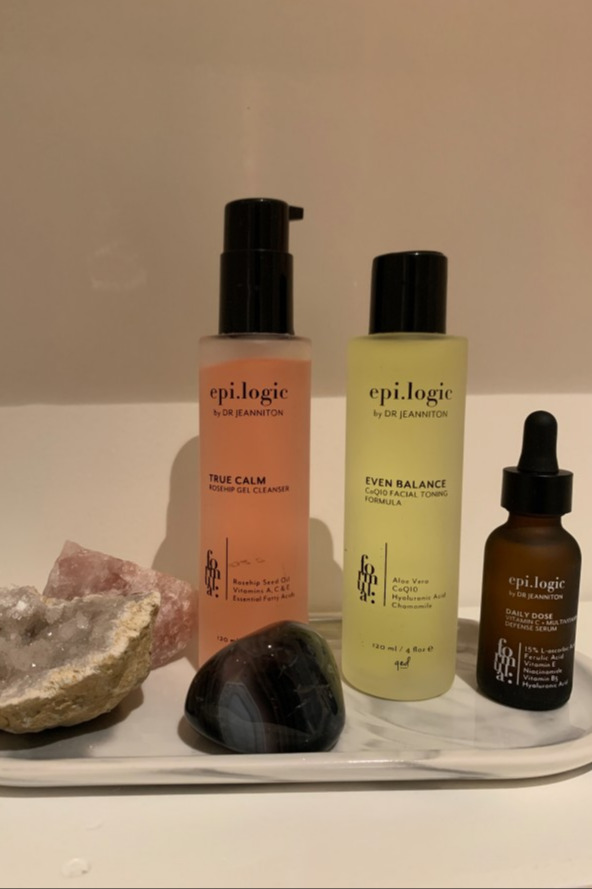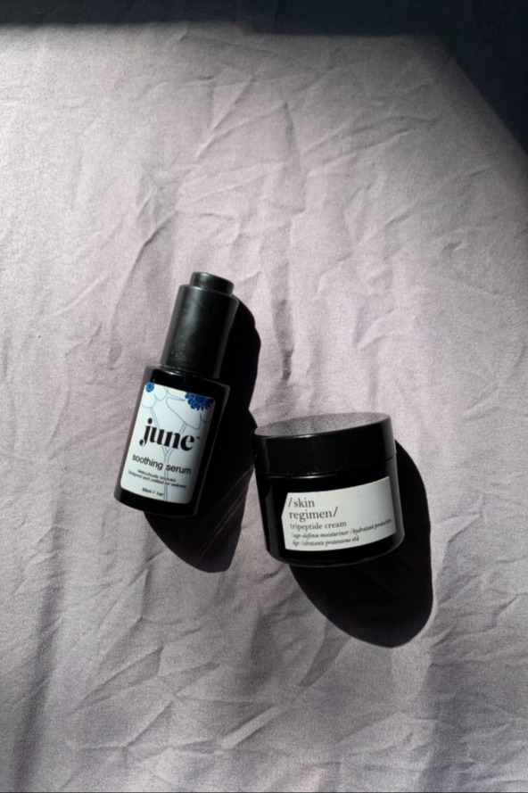 In the morning, I take a women's multivitamin and probiotics to contribute to the health of my hair, skin, nails and gut. I try to think holistically about my skin and overall health. Then, I start my skincare regimen by cleansing with Epilogic’s True Calm Rosehip Gel Cleanser. It contains antioxidants like vitamins A, C, and E, and provides a gentle cleanse without drying out my skin. Next, I like to follow up with Even Balance, a toner-slash-essence also from Epilogic. This formula is made with replenishing extracts like chamomile and aloe vera, so it’s hydrating and makes a great skin refresher. After that I reach for my treatment serums. The Daily Dose Multivitamin Defense Serum is one of my favorite vitamin C serums because it also has niacinamide and hyaluronic acid. I’ll generally follow that up with the Soothing CBD Serum from June Oil. I like that it’s multifunctional—I can use it with my gua sha, which I’ve been starting to incorporate into my morning routine more, like a serum, or as a final moisturizer. Right now I’m applying a Tripeptide Cream from Skin Regimen on top to help with anti-aging. I seal it all with Elta MD UV Daily Broad Spectrum SPF 40. Sunscreen is probably the most important step in any routine, and I never leave home without it.