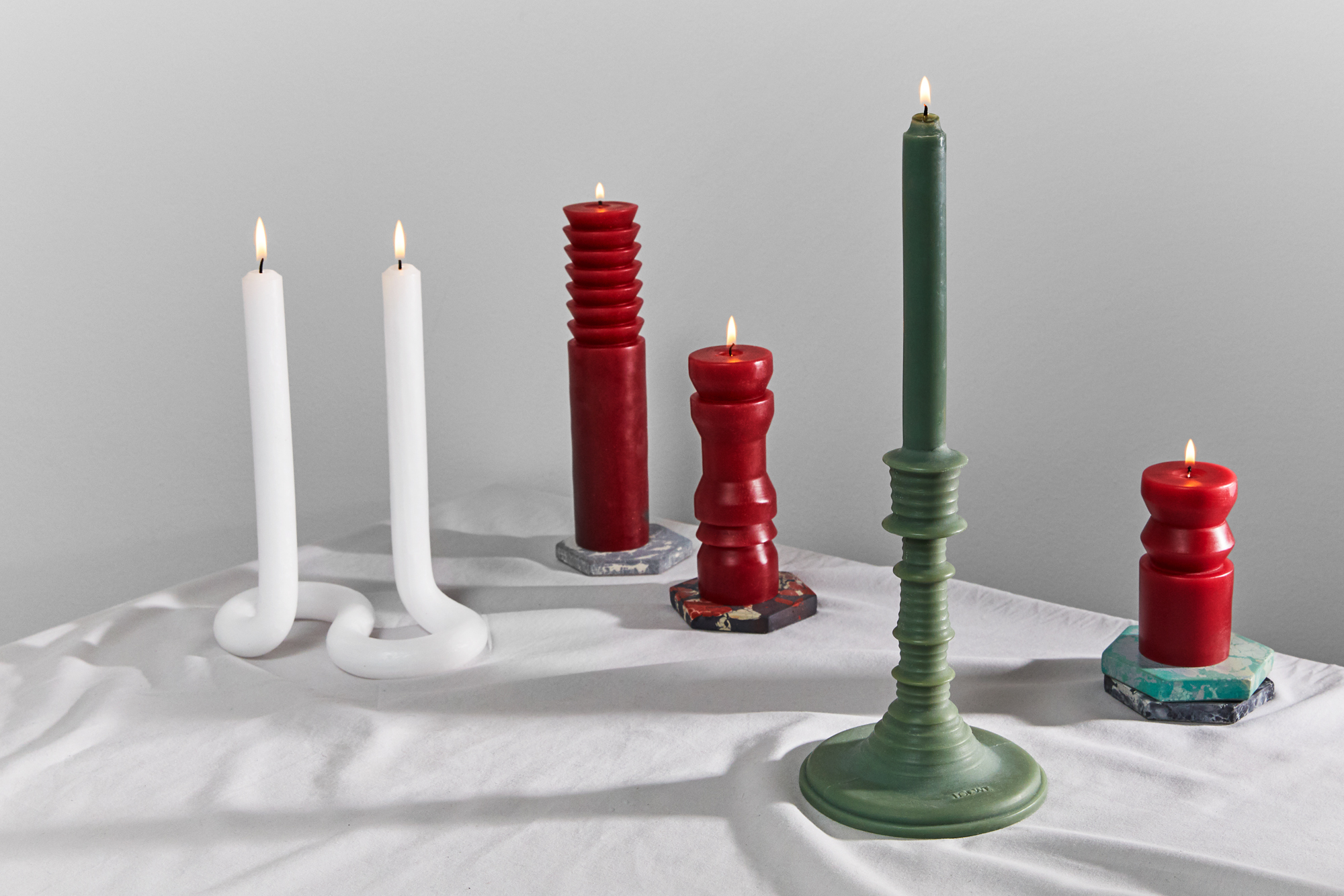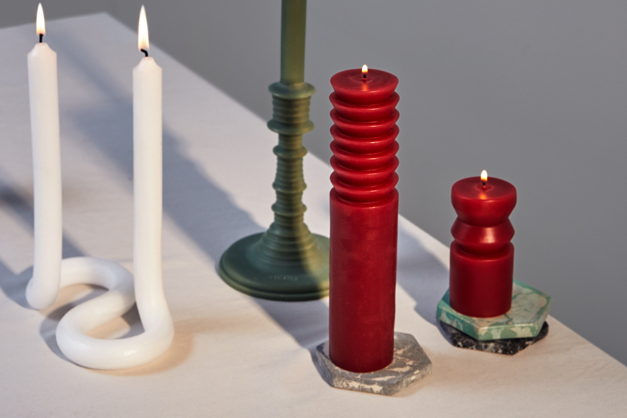 Shot with: Snowe Marble Candle Holders in White, the Aeyre Prima Candlestick and Concrete Cat Hex Coasters