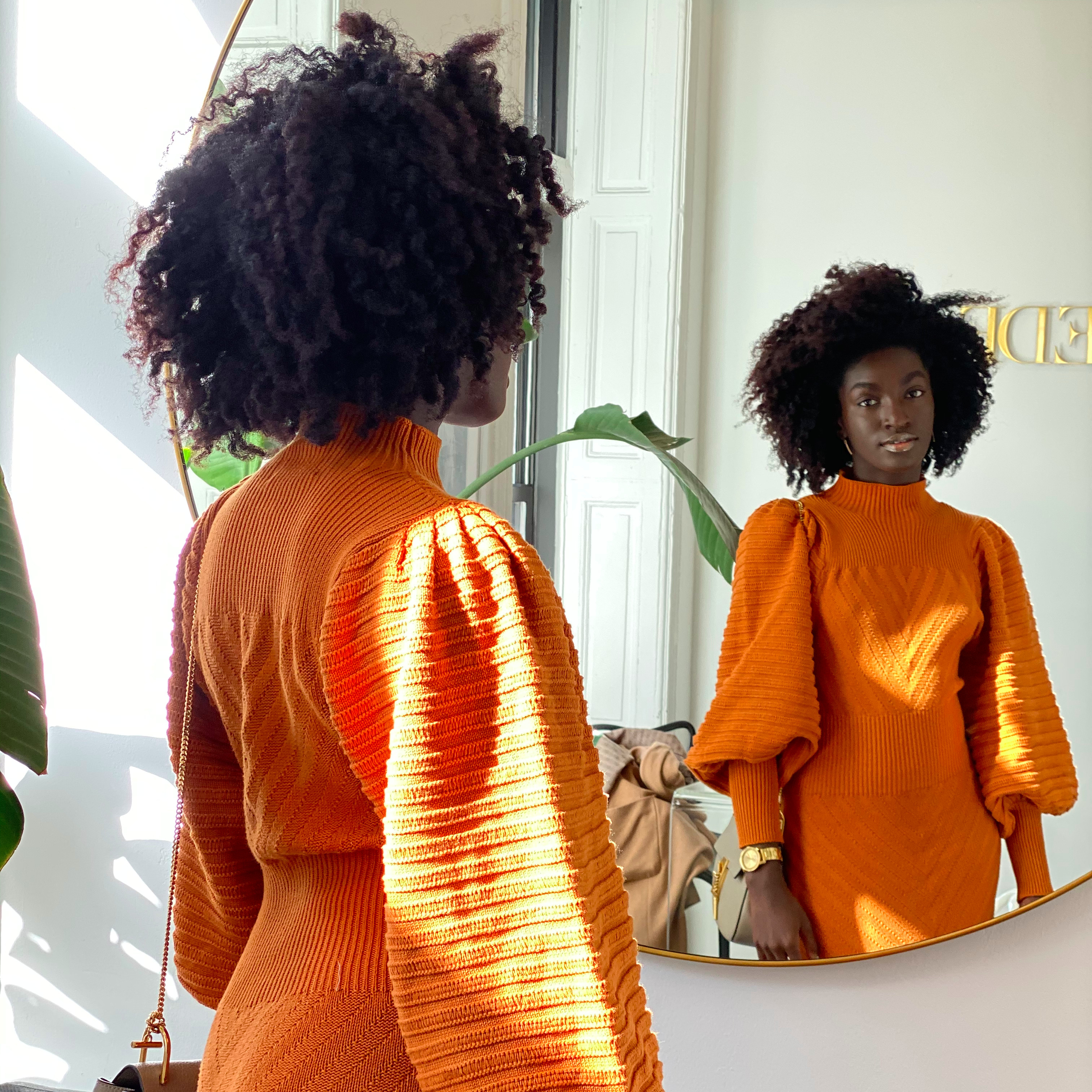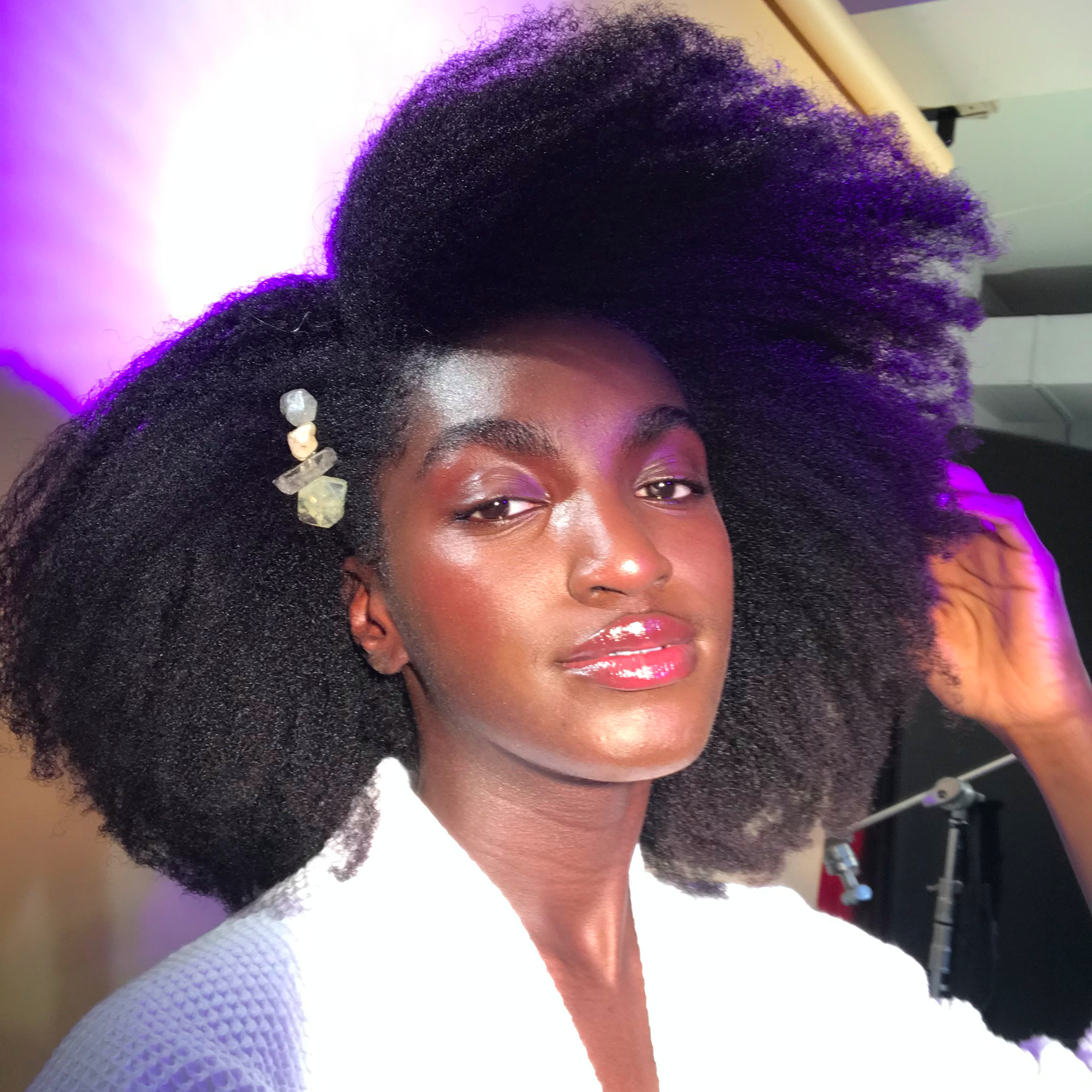 One day while eating dinner, my mom got up from the table to go to the bathroom, and came back bald. ‘I’m tired of getting perms!’ was all she said. It sparked something in me—why did I get perms? I thought straight hair was better, easier, more manageable, more societally digestible… I had conformed to it for so long that I didn’t even second guess it. After that, I learned how to care for my hair by watching my mom and YouTube. I love Naptural85, Hannah Mussette, Bubs Bee, and Chizi Duru. At least once a month I trim my hair with a process called dusting. Glossier is one of the few brands I’ve worked with that brought on a hairstylist who was knowledgeable about Black hair and actually taught me something. But in general, every time I work with a hairstylist they tell me to keep doing what I’m doing. I think I know what works best for me.