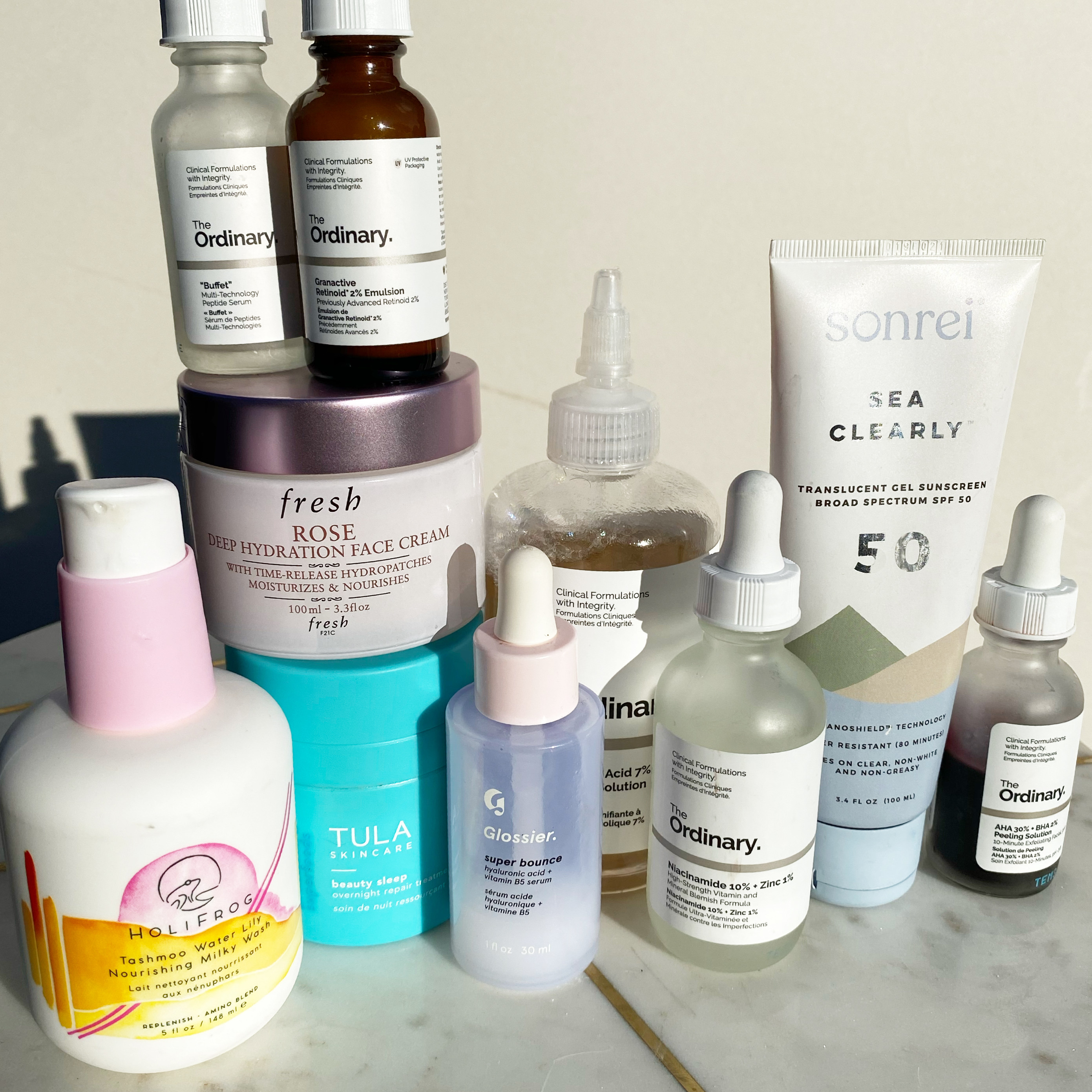 More than makeup, what I really love is skincare. In the morning I start with Holifrog’s Tashmoo cleanser. It’s my favorite cleanser ever because it’s great for sensitive skin, I don’t need another tool to really get my skin clean, and it doesn’t leave me feeling dry. Then I go in with The Ordinary’s Glycolic Toner—I used to use Glossier Solution, but I ran out. I like to wait 30 to 45 minutes and then wet my face before I apply my other serums, because I think that helps keep my skin calm. I apply hyaluronic acid and niacinamide next, and sometimes I just go straight to sunscreen. The niacinamide makes my skin look really shiny, and after I add SPF I look like a diamond. My favorite one is the Sonrei Sea Clearly—it’s so good! And it doesn’t leave a white cast.
