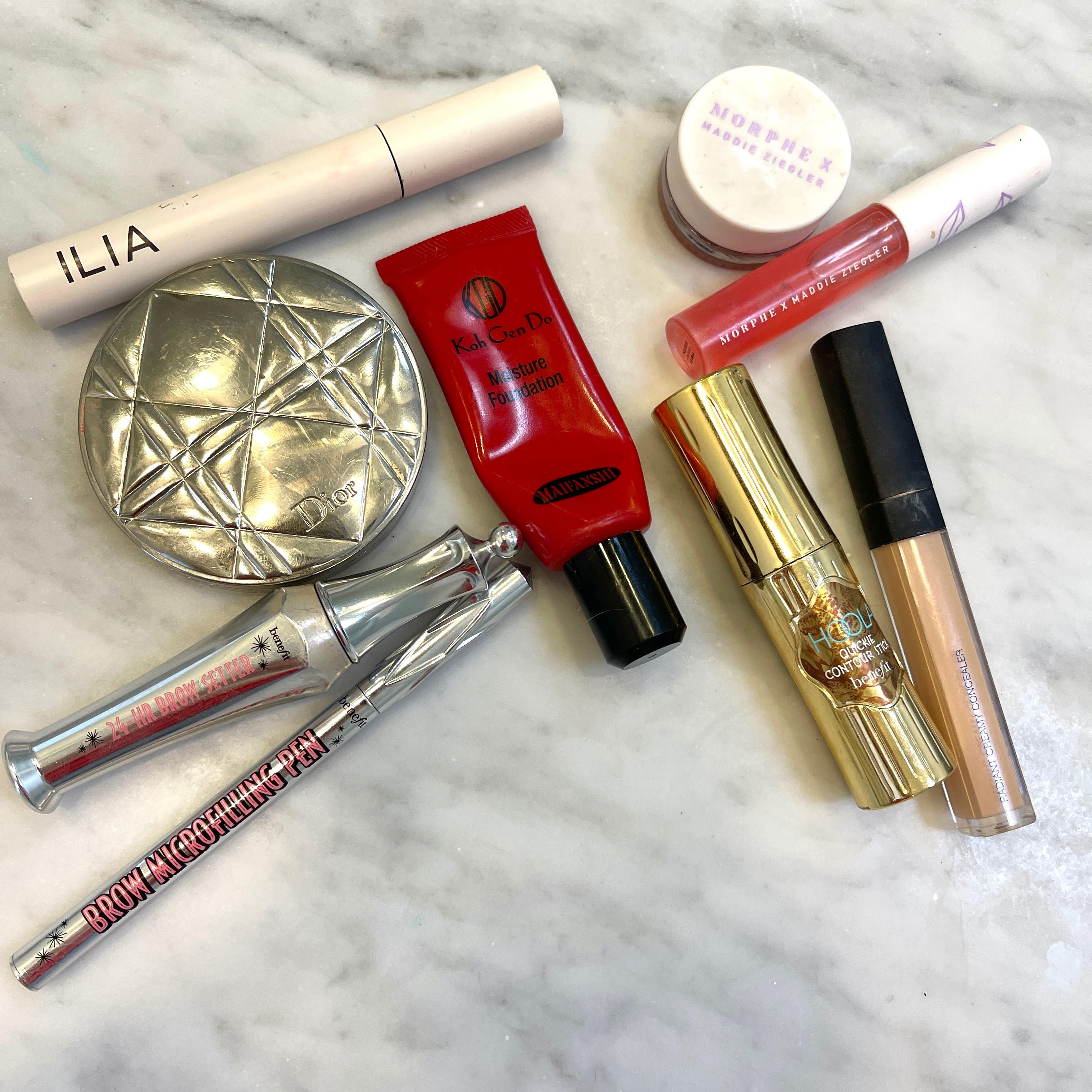 I usually start with a light base, like tinted moisturizer or Koh Gen Do’s Maifanshi Moisture Foundation. But sometimes I just do Nars Radiant Creamy Concealer. I always, always use a cream blush. I recently worked on a collection for Morphe, and it was the first collaboration where they allowed someone to give input on the formulas. That was really cool, because I made the products exactly how I wanted. I use the cream blush from my collection every day because, of course I do, I‘ve literally been looking for something like it for years. It’s called Wondertint, and it has an almost mousse-y, velvet texture that really looks like skin. It’s not sticky, it stays throughout the day, it blends really well, and you just need two little dots. Plus it actually goes on nicely over powders, which is normally hard to do with cream formulas. Anyway, it’s perfect. I use the Dew Bomb highlighter from my collection as well. I love to do graphic liner because I can keep my face natural, and the pop on my eyes adds so much. I can use a wet liner brush to make any eyeshadow into an eyeliner, but otherwise I’m obsessed with Suva’s gel liners. I feel like those give me the best results because they’re so easy to manipulate and so pigmented. I love a bright look.