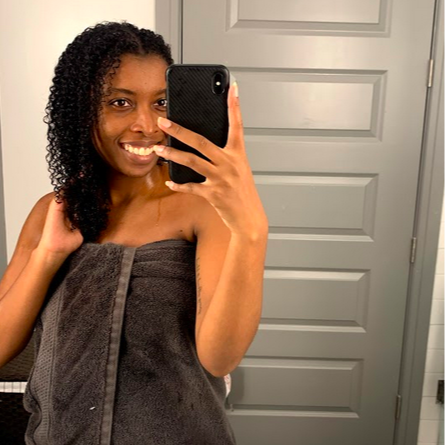 I two-strand twist my hair every night to keep it from getting knotty, and I also sleep in a bonnet. Then in the morning I just undo my twists, spray a mix of water and leave-in conditioner, and oil my hair. That daily routine keeps my curls looking fresh and moisturized until wash day on Sunday. I love turning wash day into a hip-hop karaoke session, and I usually post videos on my Instagram Story. My wash day products are all from Black-founded hair care companies. I wash with the Camille Rose Sweet Ginger Cleansing Rinse and deep condition it with the Shea Moisture Strengthen and Restore Treatment Masque, which I leave in for 30 minutes under a shower cap. I wash out the masque, add in Camille Rose Moroccan Pear Conditioning Custard, wash that out, and then use Kinky-Curly Knot Today conditioner to detangle. The easiest way for me to detangle is by separating my hair into four to six sections and detangling them one at a time. Once I’m finished with a section, I put in Miss Jessie’s Pillow Soft Curls and Jamaican Black Castor Oil from Tropic Isle to seal the moisture.