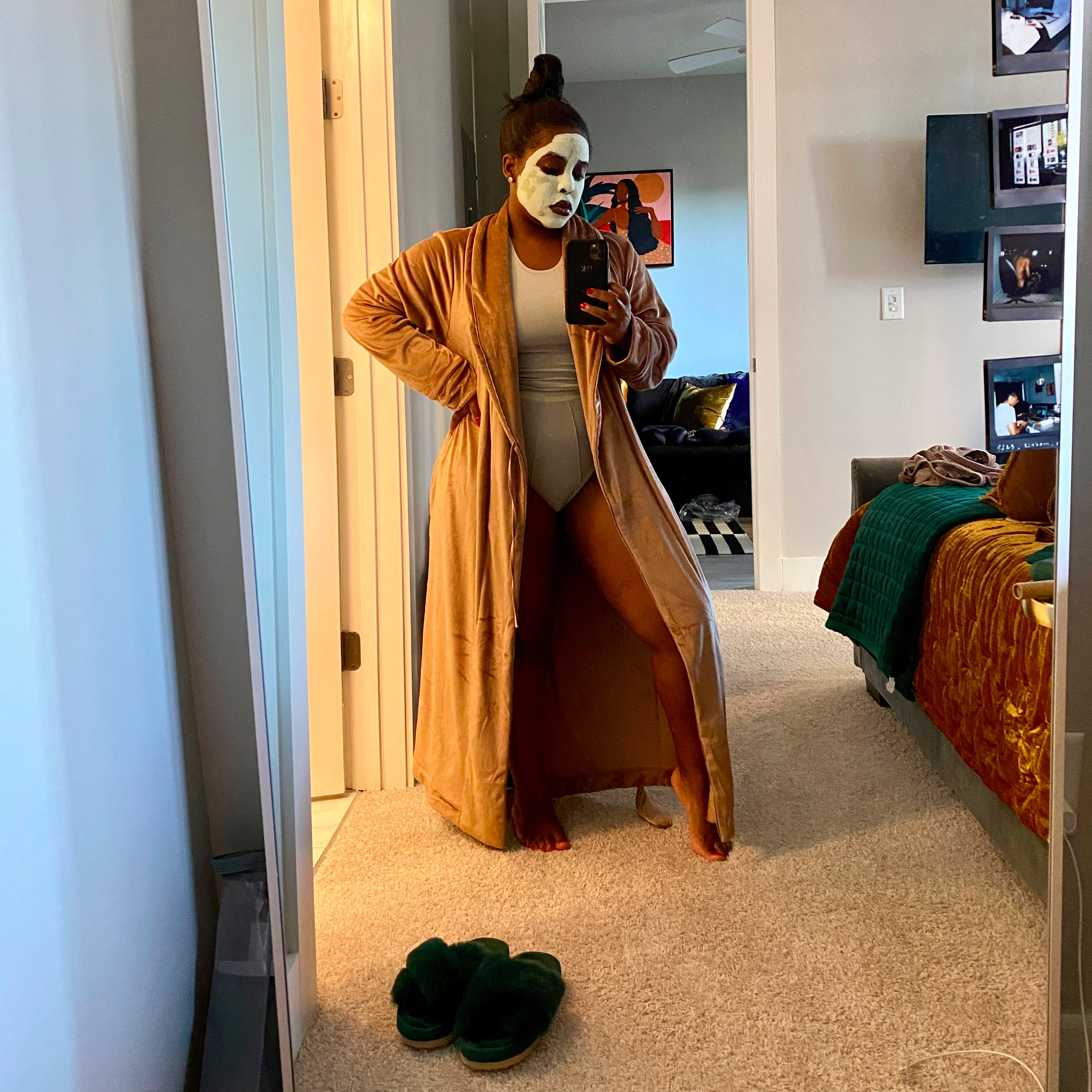 In the morning, I put on my robe, go to the kitchen, and turn on the kettle. While the water’s heating I do my skincare. I'm a huge fan of the Supergreat app—they sent me this powder face wash with reishi mushrooms from a teen brand called Recurrent, and it literally looks like seasoning salt. I wash with that first, and then I double cleanse with the iS Clinical Warming Honey Cleanser because honey is antibacterial and really good for acne and eczema. I get eczema in the weirdest places—it’s only my eyelids, knee caps, and butt. Next I apply our topical product, which is in the final stages of formulation. I cover any maskne with pimple patches—usually Starface or Evenprime. And then I go back into the kitchen to make my Mud Wtr. It’s basically mushroom coffee with a ton of adaptogens in it—it’s seriously the best thing that’s ever happened to me. I’ve been working with Black chefs to develop adaptogenic recipes for our site that are familiar in the Black kitchen—for example, instead of mushroom coffee, a chef made us an adaptogenic chicken rub. You still get the benefits, but it’s something you’re used to cooking and consuming, and maybe that’ll make you more open to other things later on. Recently, all of these people in the Black wellness space are going vegan and practicing yoga… I love that for us! But it doesn't mean you don't want your grandma's biscuits, or fried chicken on Sunday, or mimosas at brunch with your friends. Being relatable is really important to us, and a healthy lifestyle doesn’t have to be restrictive or inaccessible. I worked out this morning, but I also had tacos for lunch, you know? There's a balance.